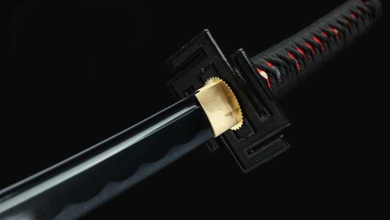 - Tsuba (鍔): hakaristin muotoinen veistetty rauta, musta.