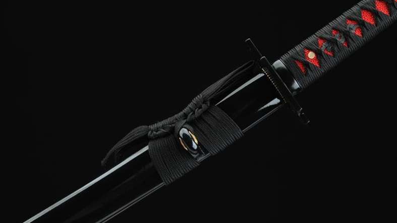- Tsuka (柄): punainen rausku nahkakahva, jossa musta punottu Ito ja musta fuchi.