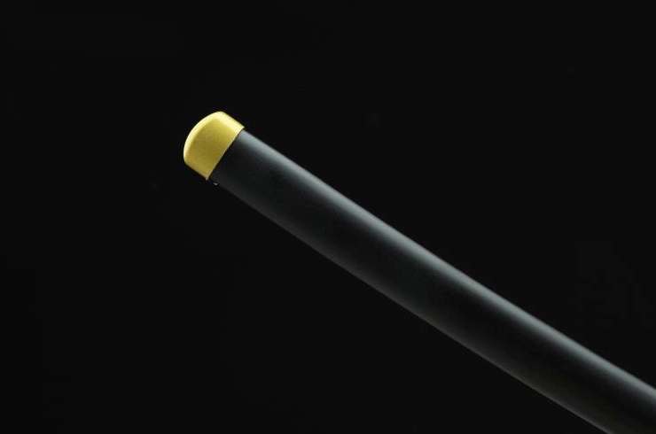 - Tsuka-ITO (柄糸): musta punottu nahka ja kultainen fuchi.
