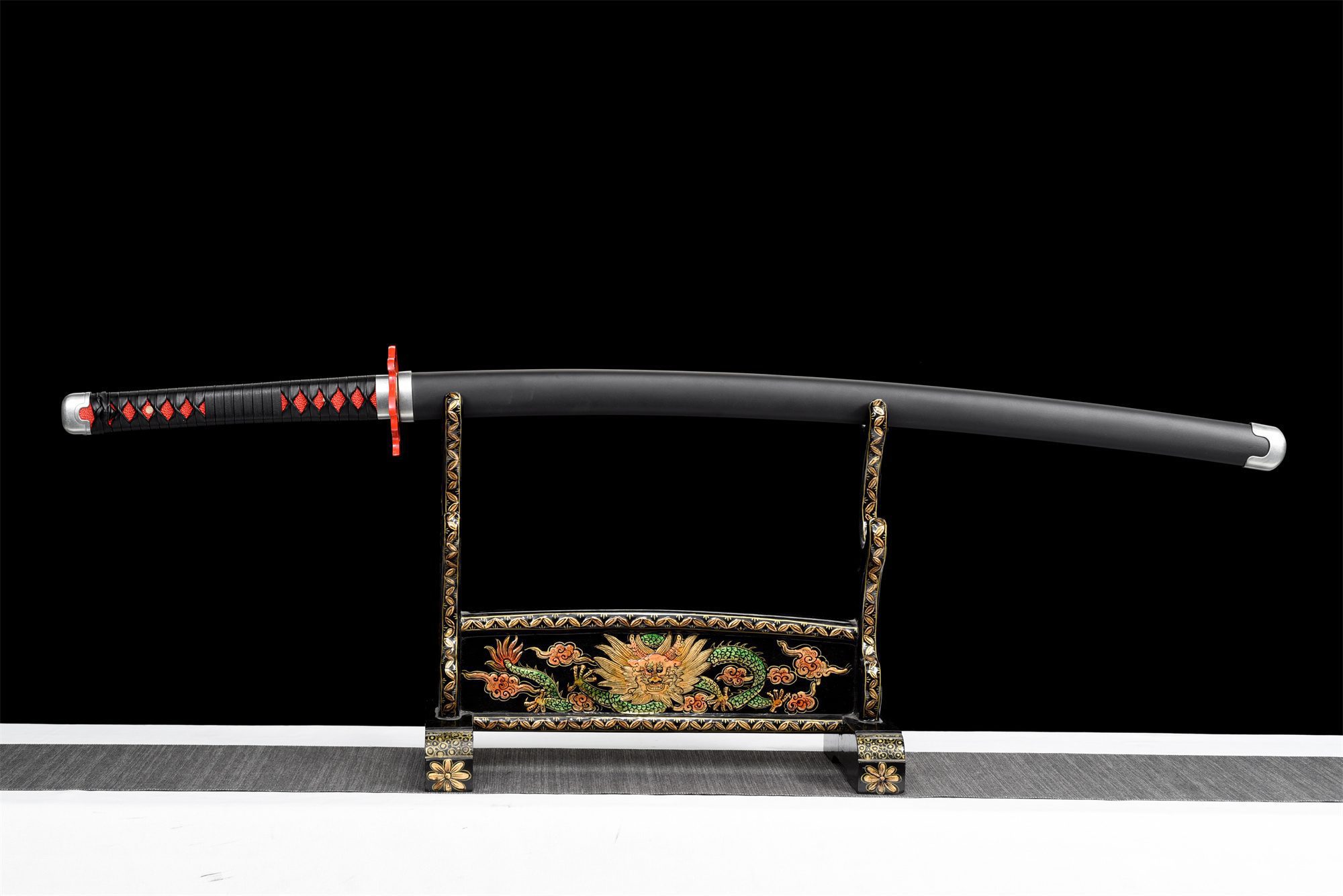 T10-teräksestä valmistetun terän hopea-musta viimeistely viittaa valon ja pimeyden dualismiin, joka on teoksen keskeinen teema. Kahva (tsuba) jäljittelee tarkasti oranssin, punaisen ja mustan liekkikuvioita, jotka edustavat Tanjiro Kamadon tulenhallintaa. Kahva (tsuka) yhdistää harmonisesti massiivipuuta ja punaista keinonahkaa, kun taas musta synteettinen nahkainen punos tarjoaa tukevan ja mukavan otteen. Hopeiset renkaat (fuchi ja kashira) viimeistelevät kokonaisuuden tyylikkäästi, ja messinkinen habaki takaa täydellisen istuvuuden tuppeen. Musta lakattu puinen saya, jonka kärjet on koristeltu hopeisilla viimeistelyillä, suojaa terää säilyttäen alkuperäisen tyylikkään ja hienostuneen estetiikan.