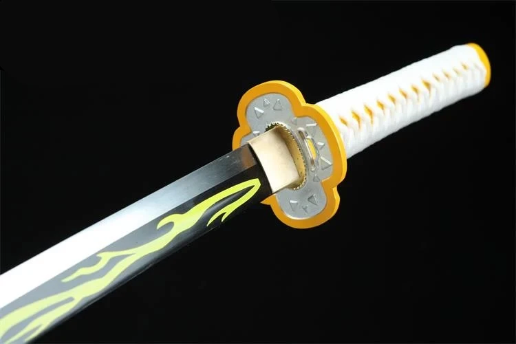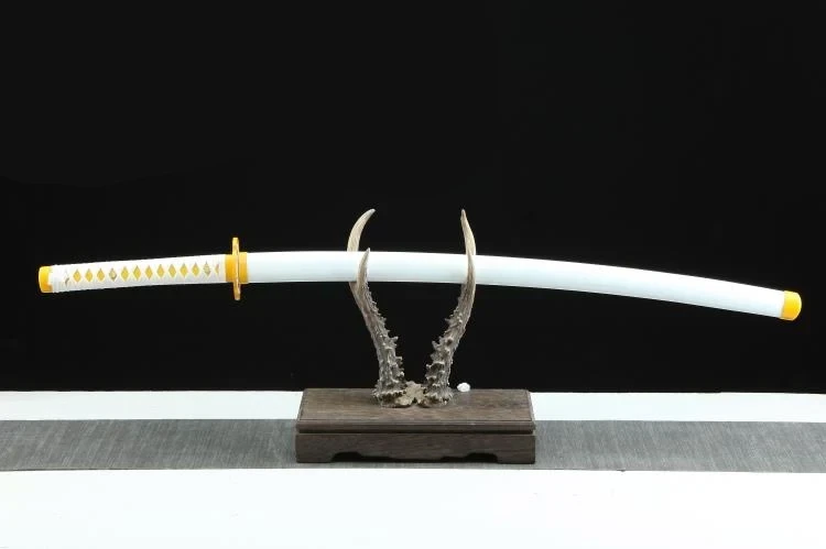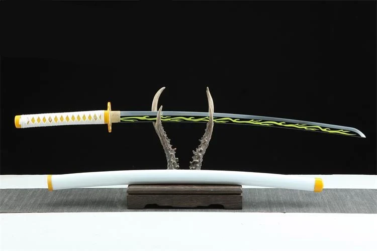 Tämä teräksinen katana-miekka on täydellinen kopio Zenitsu Agatsuman Sun Blade -miekasta Demon Slayer -anime-sarjasta. Sen muotoilu heijastaa hahmon hallitsevaa taitoa salamoiden ja sähkön käytössä.