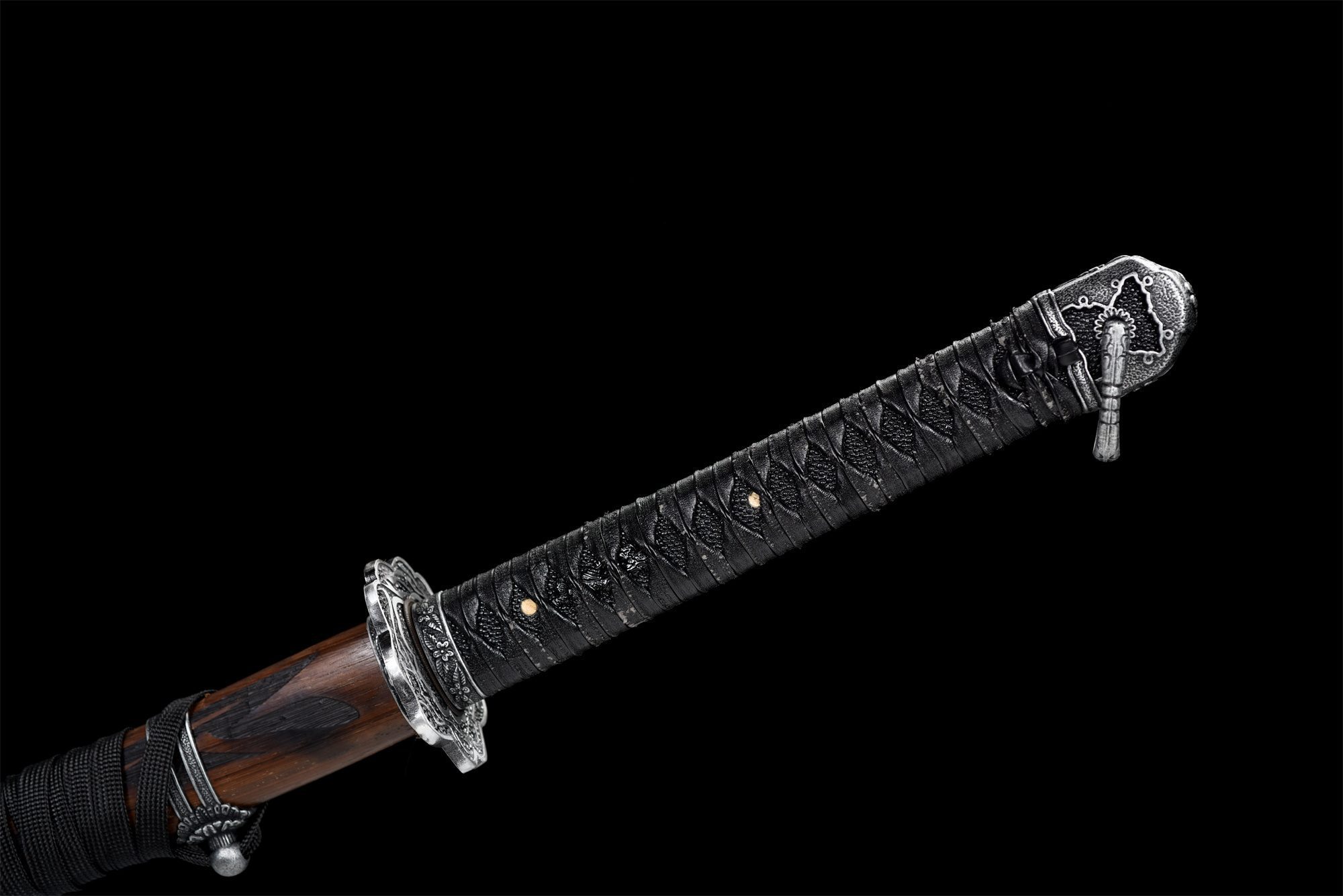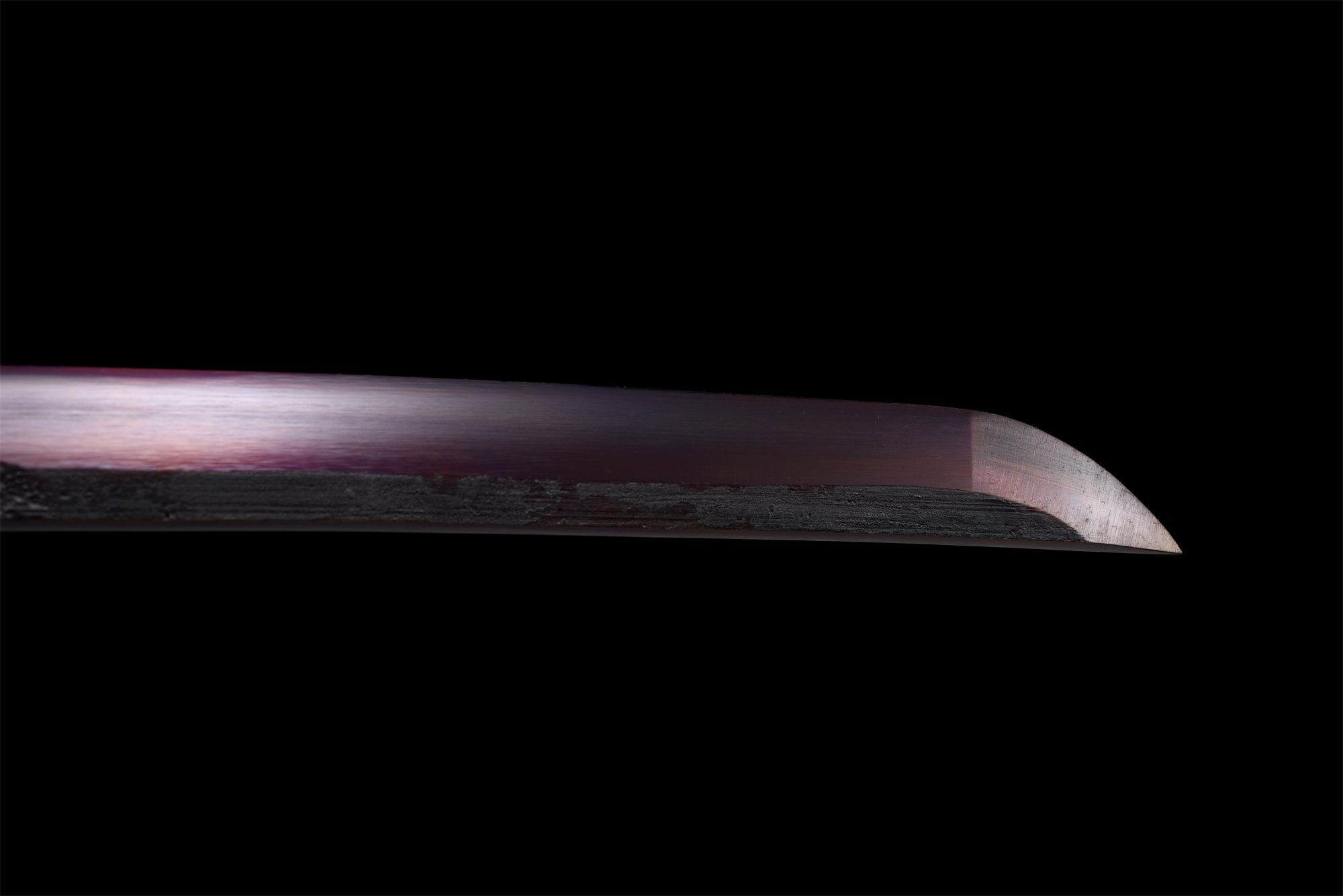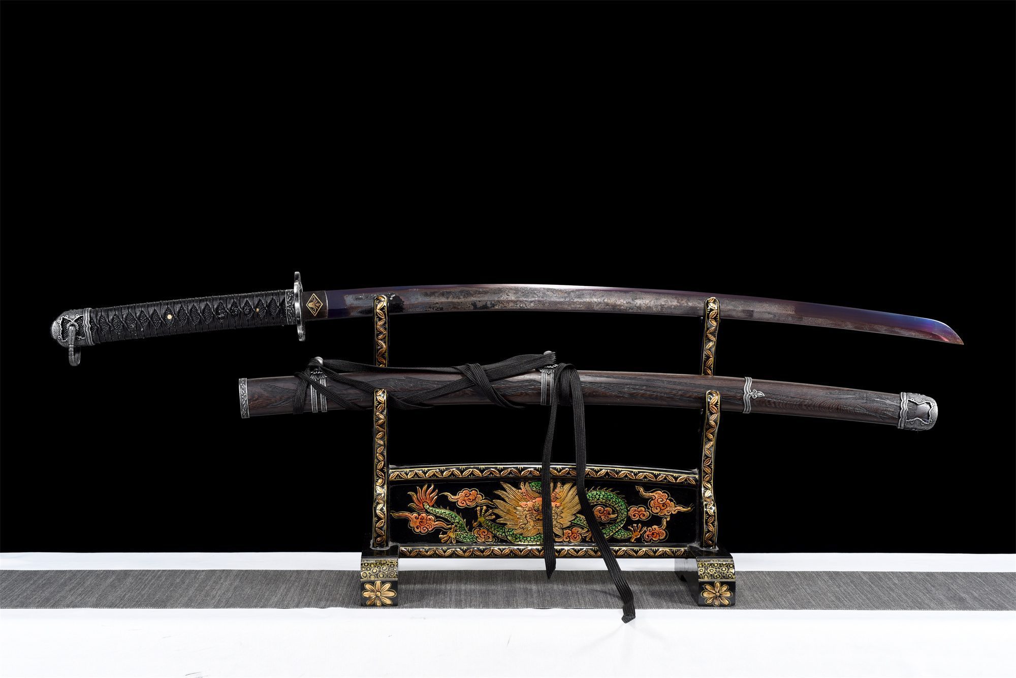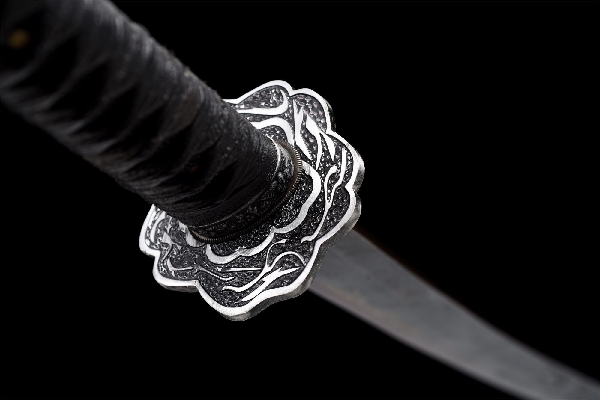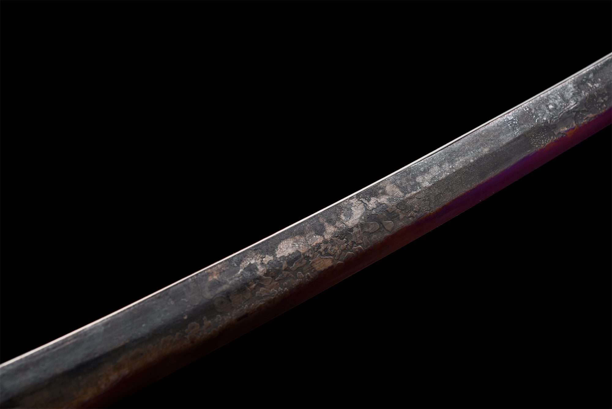 Tämän replikan mangaaniteräksinen terä erottuu sinisestä patinapinnoitteestaan, jossa on hopeisia, violetteja ja punaisia korostuksia, jotka tuovat esiin tämän jumalallisen miekan mystisen olemuksen. Tämä ainutlaatuinen väritys symboloi Mortal Bladen yliluonnollista luonnetta ja sen kykyä katkaista kuolemattomuuden siteet. Hopeoitu rautaseoskaulus (tsuba) on lotuskukan muotoinen, joka on buddhalaisessa perinteessä hengellisen puhtauden ja uudelleensyntymisen symboli, ja musta messinkinen habaki toistavat samaa kukkakuviointia. Kahva (tsuka) yhdistää harmonisesti mustan rauskuahvenennahan ja ruusupuun, ja se on kääritty mustalla punoksella (tsuka-ito) timanttikuvioin, joka takaa tukevan ja tyylikkään otteen. Menuki edustaa mustaa lohikäärmettä, myyttistä olentoa, joka liittyy viisauteen ja jumalalliseen voimaan. Jalo ruusupuisesta valmistettu tupen (saya) on koristeltu hienostuneilla yksityiskohdilla, kuten metallilla ympäröidyllä hopeisella koiguchilla ja koristeellisella kojirilla, kun taas kaksi metallista vyölenkkiä mahdollistavat aidon sotilaallisen kantamisen.