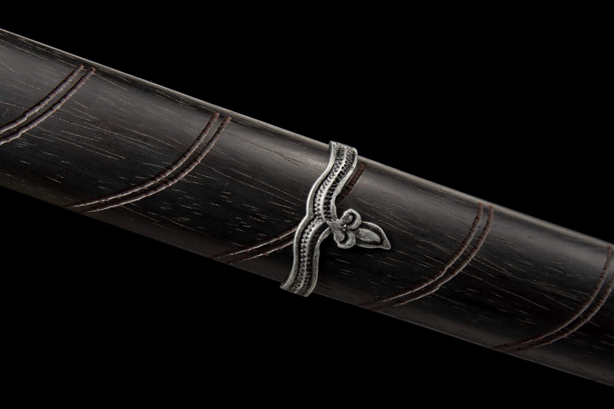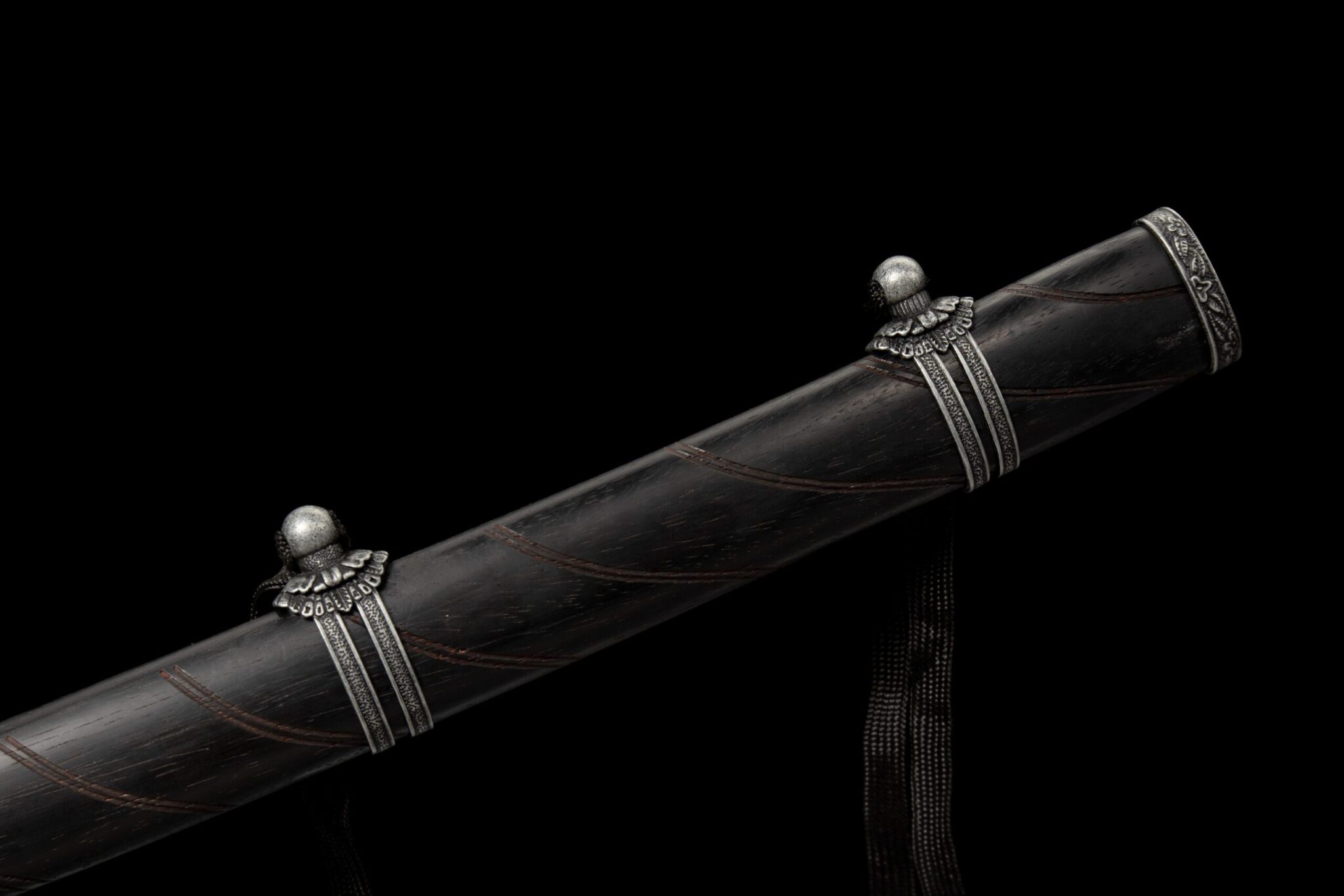 - Tuppi (Saya 鞘): Ruusupuu-tuppi hopeaseoskoristeilla (Kojiri ja Koiguchi).