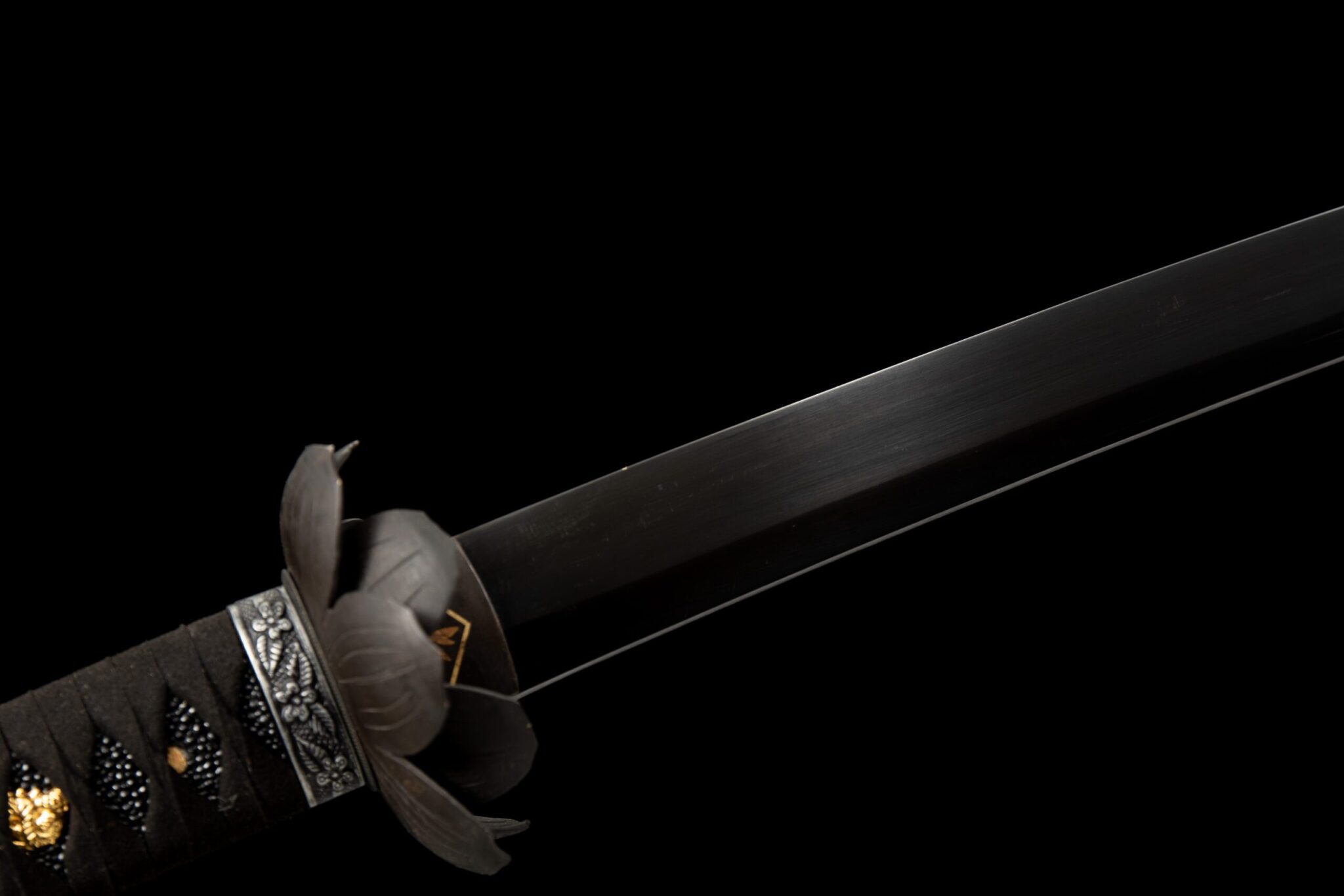 - Habaki (鎺): Musta messinki, koristeltu lootuskukalla.