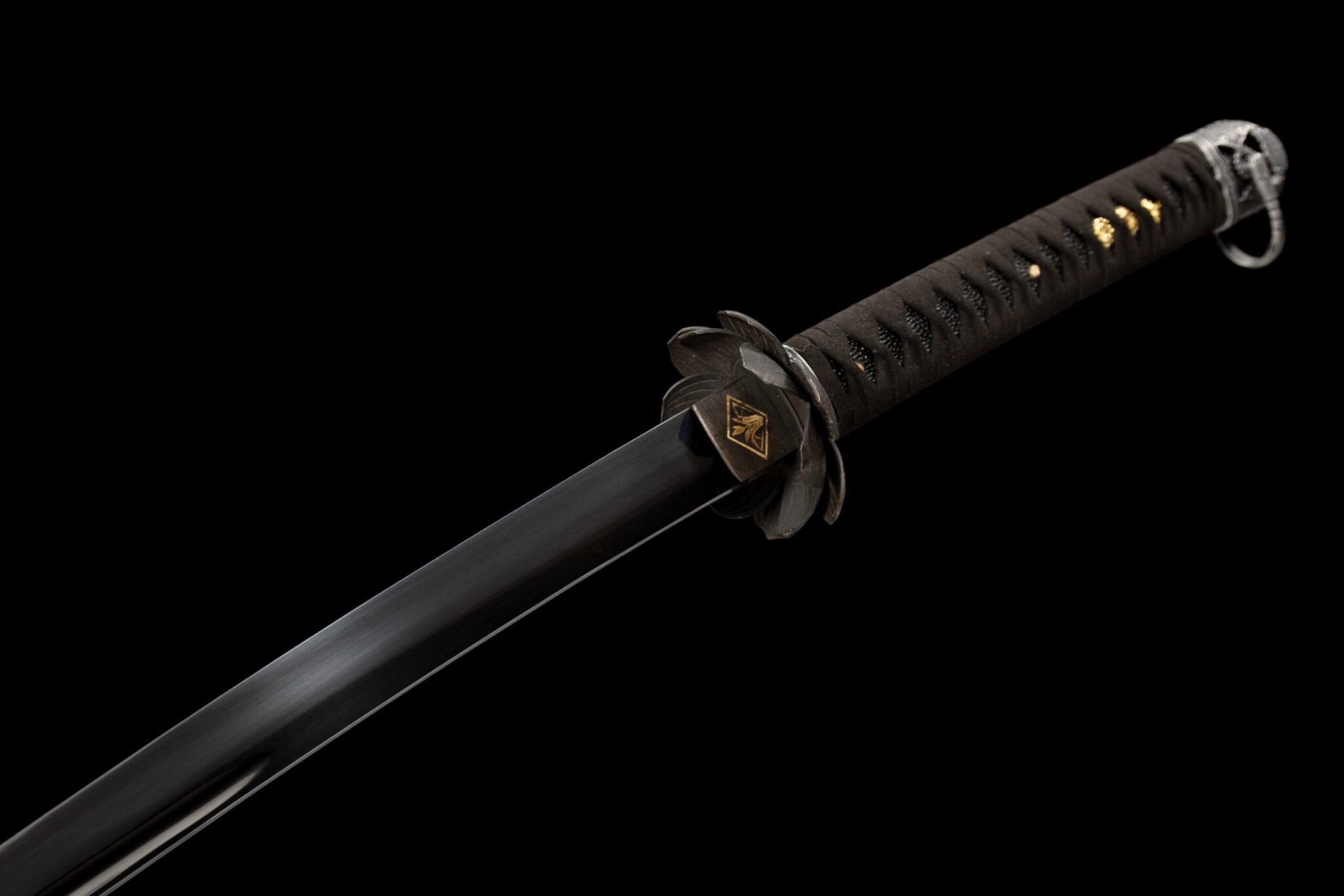 - Tsuka-ITO (柄糸): Musta punottu timanttikuvio kahvan yläpuolella.