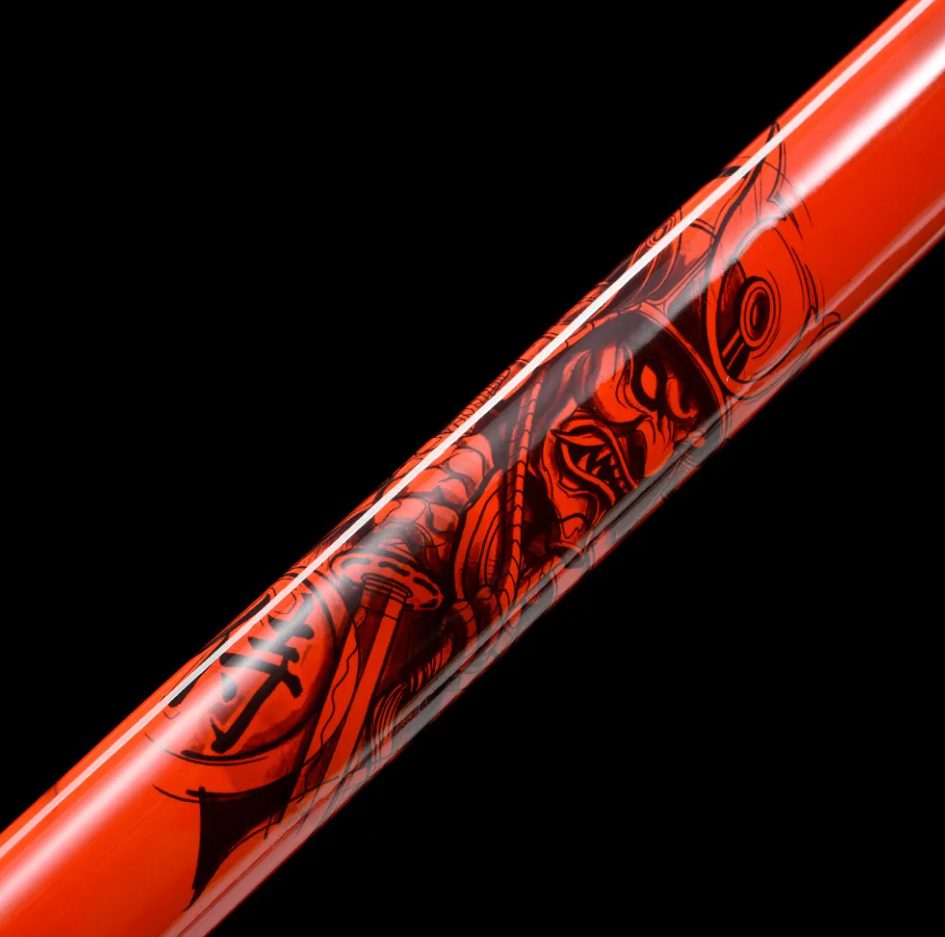 Tässä punaisessa ninjatossa on terävä, punainen 1060-teräksinen terä, jossa on upea liekkimäinen, metallinvärinen hamon (刃文). Puinen tuppi on lakattu voimakkaasti punaiseksi, ja siihen on lisätty samurai-kuvio. Kovapuinen kahva ja PU-punainen samegawa, jossa on musta menuki, tarjoavat erittäin hyvän otteen.