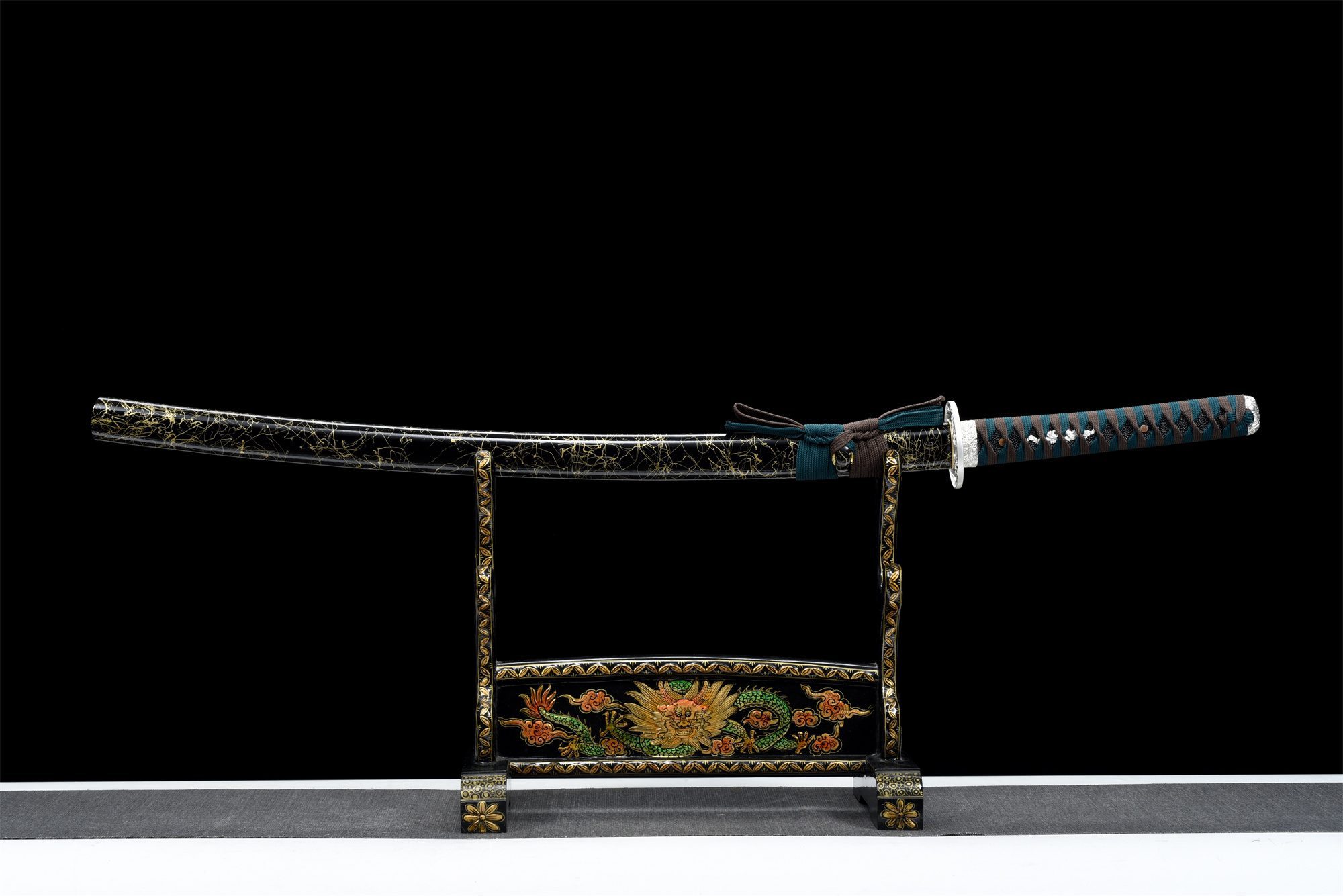 T10-teräksestä valmistetun terän syvän sininen sävy heijastaa valoa kuin järven heijastukset hämärässä, kun taas perinteinen hamon-kuvio luo terän reunaan sen ominaiset aaltoilut. Pyöreässä hopeaseoksesta valmistetussa tsubassa on hienosti veistetty lohikäärme, joka näyttää heräävän eloon muuttuvassa valossa ja varjoissa. Kahva paljastaa merkittävän käsityötaidon: musta rausku nahka tarjoaa tukevan ja mukavan otteen, ja se on peitetty ruskealla ja sinisellä tsuka-ito-punoksella, joka muodostaa täydellisiä geometrisia timantteja. Menuki kuvaa valkoisia lohikäärmeitä, jotka muodostavat elegantin kontrastin koko veitsen tummiin sävyihin. Musta lakattu massiivipuinen tuppi on koristeltu herkillä keltaisilla kuvioilla, jotka luovat silmiinpistävän kontrastin, ja sitä täydentää sininen ja ruskea sageo, joka harmonisesti toistaa punoksen värit.
