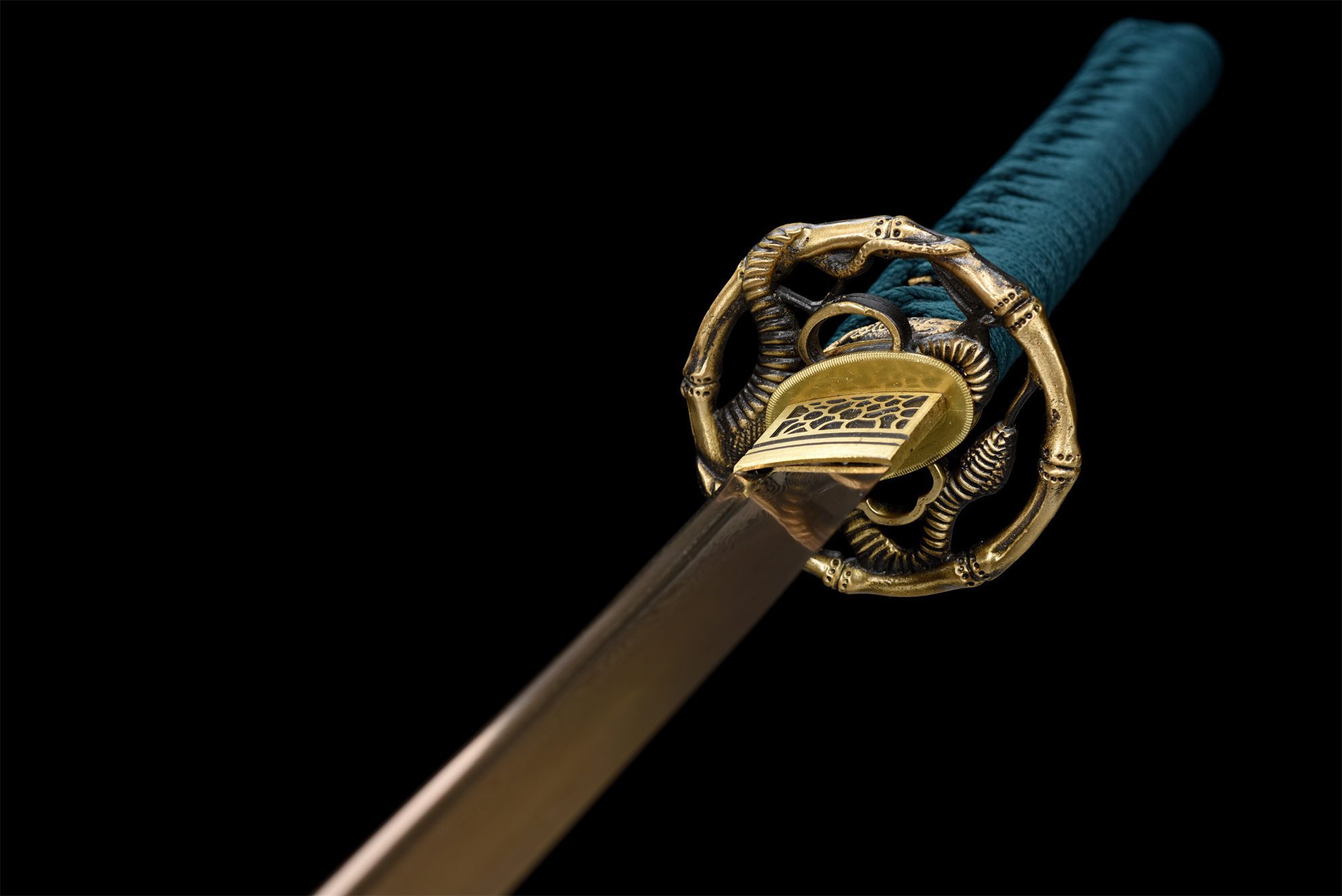 - Suojus (Tsuba 鍔): Pyöreä kupari, johon on kaiverrettu suojuksen ympärille kietoutunut käärme.