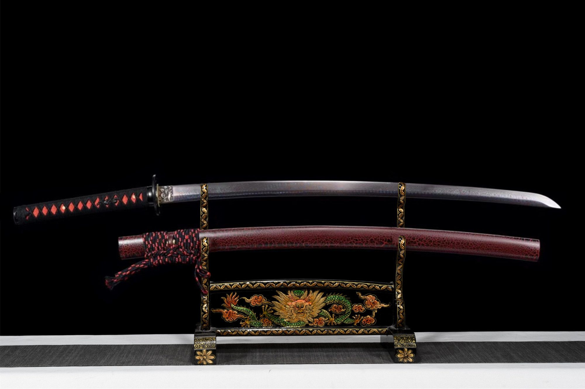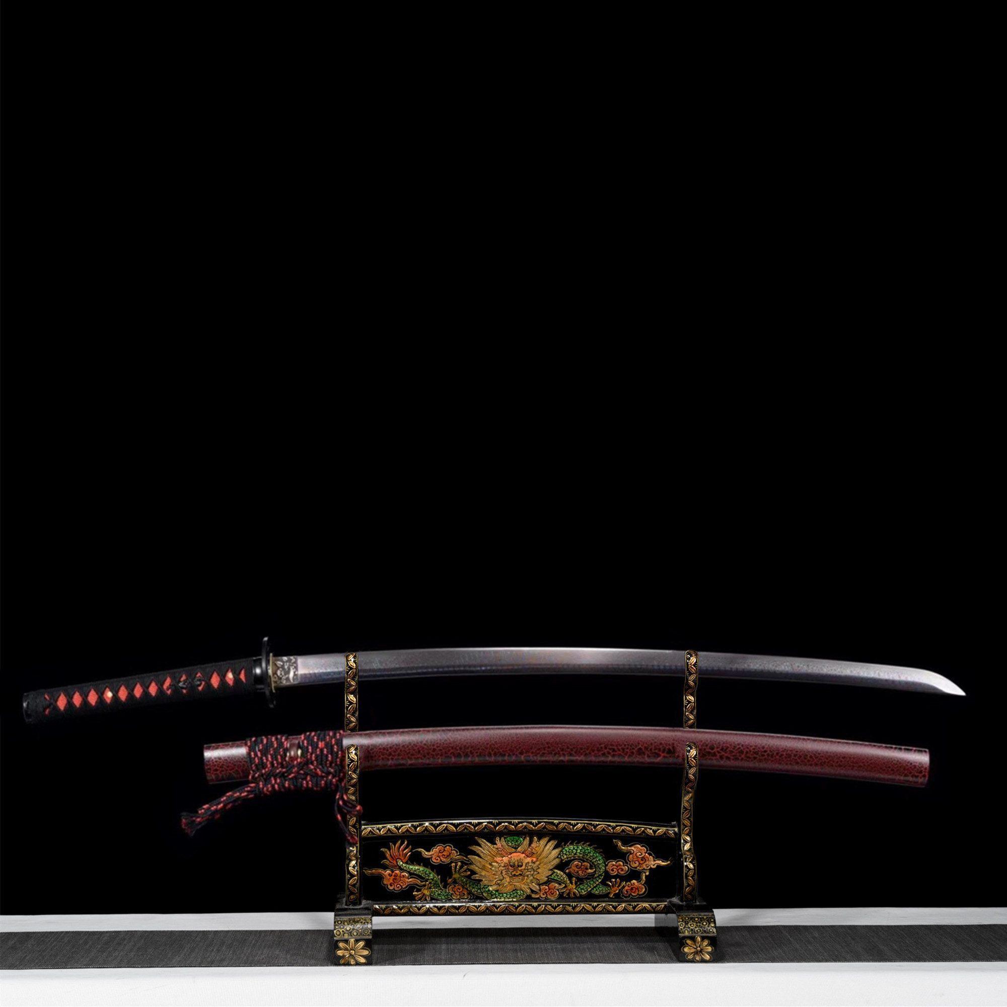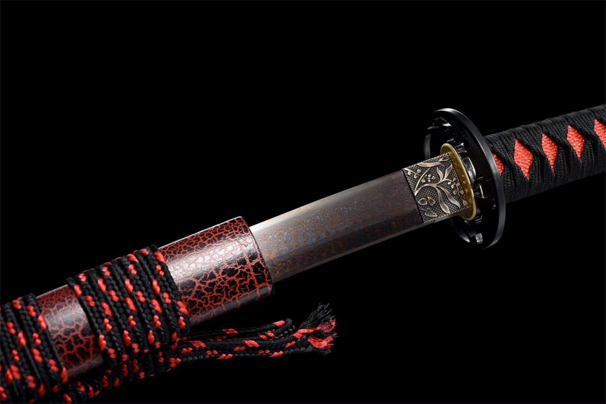 Sen damaskusteräksinen terä paljastaa aaltoilevia punaisia ja harmaita kuvioita, jotka muistuttavat pimeydessä tanssivia liekkejä. Tämä perinteinen taontatekniikka luo metallisia suonia, jotka näyttävät sykkivän elämää, ja jokainen metallin taitos kertoo tarinan sen luomisesta. Pyöreä, ontto tsuba mustasta metalliseoksesta kehystää tämän värikkään sinfonian, kun taas kukka-aiheilla koristeltu hopeinen habaki lisää hienostuneisuutta, joka kontrastoi kokonaisuuden voimakkuuden kanssa. Käsin, joka on päällystetty punaisella keinonahalla, tarjoaa tukevan otteen, ja se on kääritty mustaan tsuka-itoon, jonka timanttikuvio luo elegantin geometrisen kuvion. Mustia lohikäärmeitä esittävät menuki sulautuvat harmonisesti tähän sommitelmaan, joka symboloi mystistä voimaa. Musta ja punainen lakattu tuppi jatkaa tätä dramaattista estetiikkaa, ja sitä täydentää väreiltään sopiva sageo.