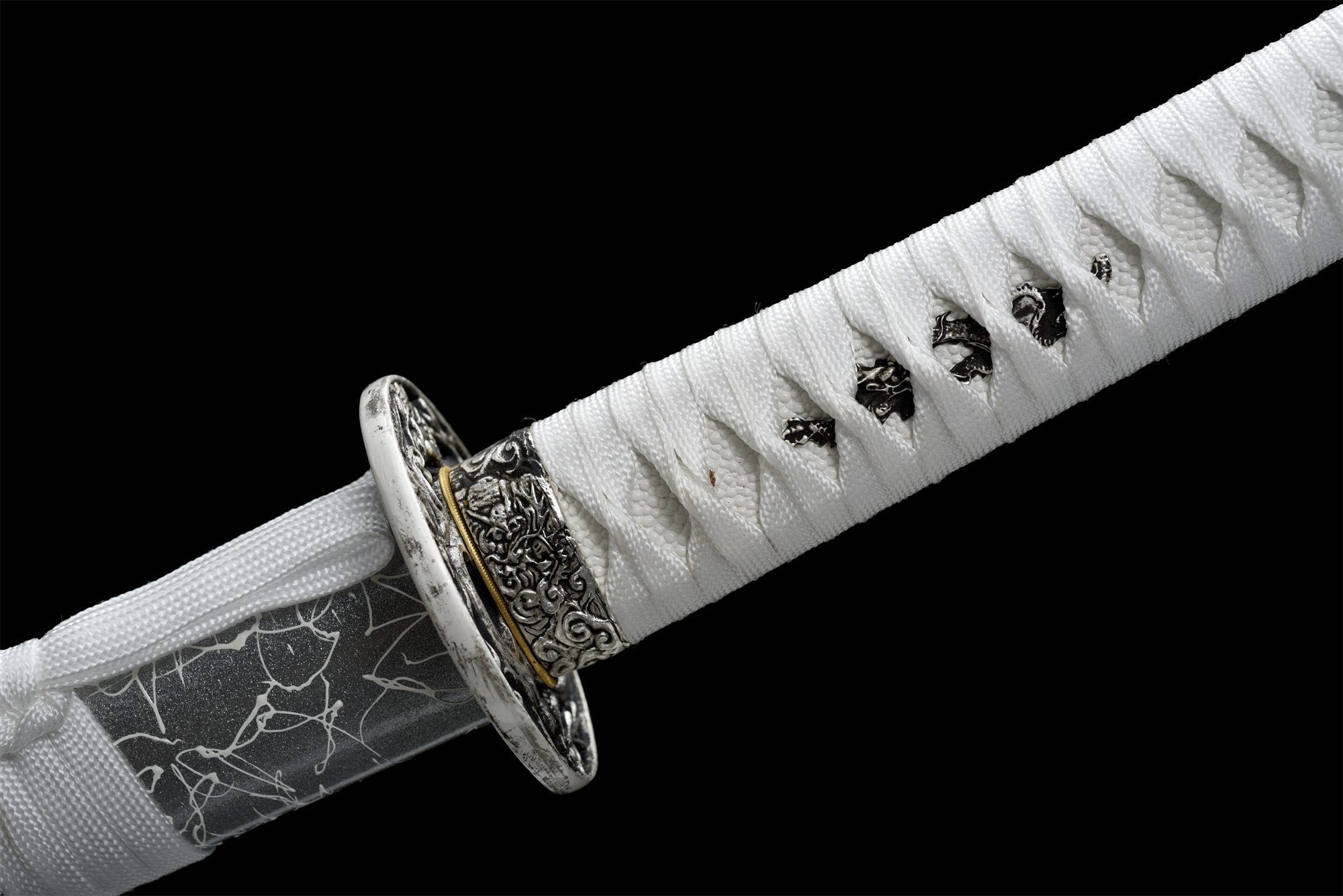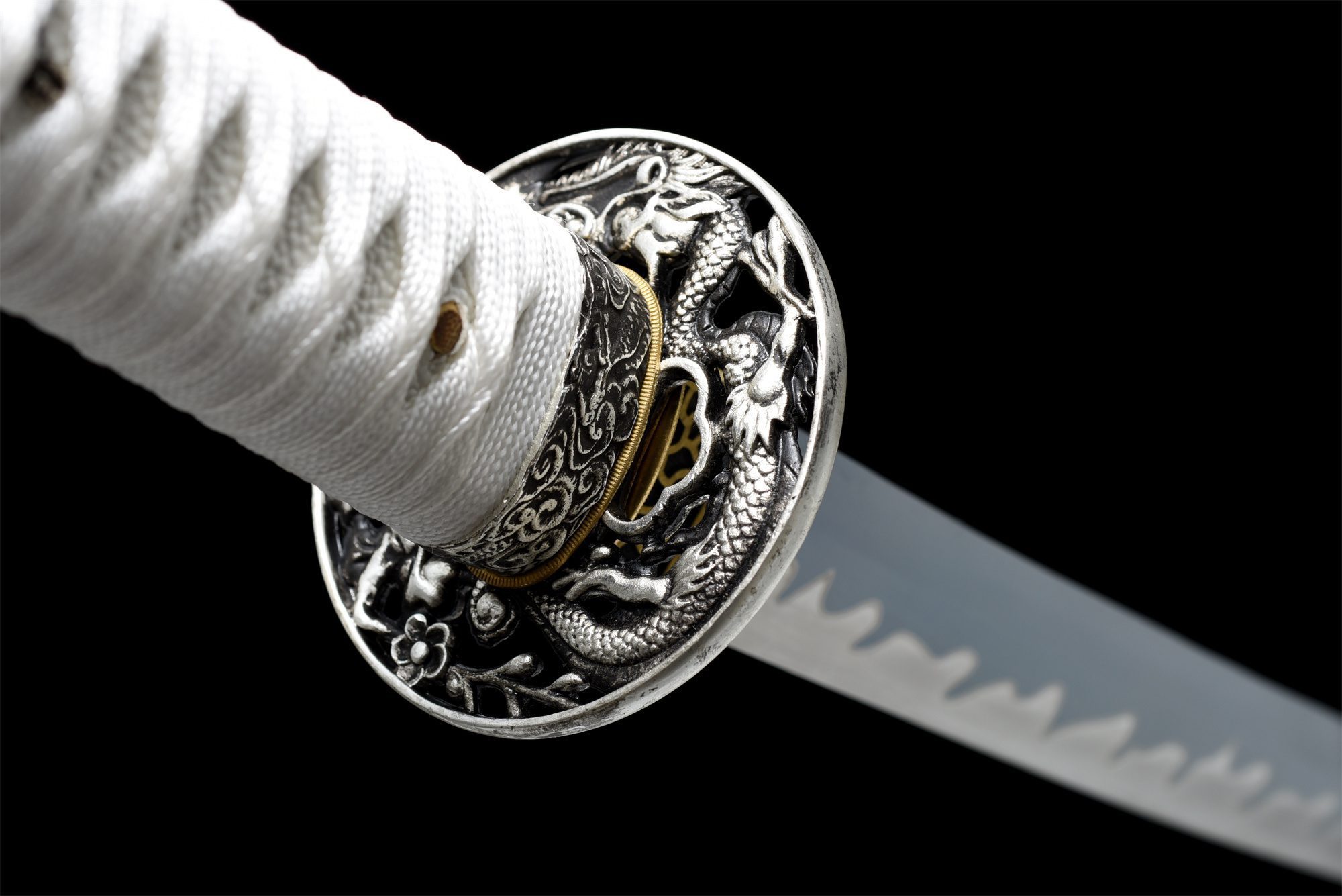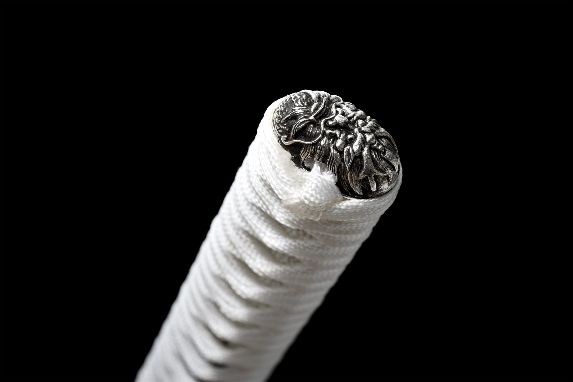 Mangaaniteräksestä valmistetun terän musta grillattu viimeistely kontrastoi kauniisti terän reunassa näkyvän hamon (刃文) kanssa. Tämä erilainen karkaisutekniikka luo silmiinpistävän visuaalisen vaikutelman ja parantaa terän leikkausominaisuuksia. Pyöristetyssä tsubassa on musta ja hopeinen kaiverrettu lohikäärme, joka on japanilaisessa perinteessä voiman ja viisauden symboli. Kahva yhdistää harmonisesti massiivipuuta ja valkoista keinonahkaa, kun taas valkoinen punos (tsuka-ito) muodostaa timanttikuvioita, jotka takaavat tukevan ja tyylikkään otteen. Menuki-koristeet esittävät mustia lohikäärmeitä, jotka muistuttavat näiden legendaaristen olentojen mystisestä voimasta. Massiivinen harmaa lakattu puinen saya on koristeltu hienostuneilla valkoisilla yksityiskohdilla, joita täydentää valkoinen sageo, joka korostaa kokonaisuuden esteettistä yhtenäisyyttä.