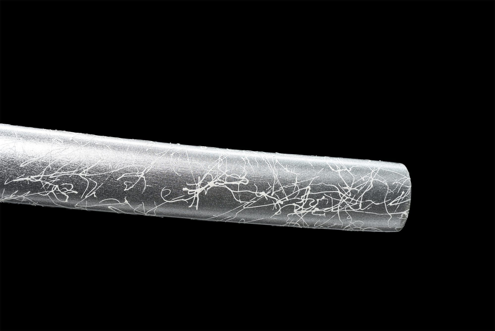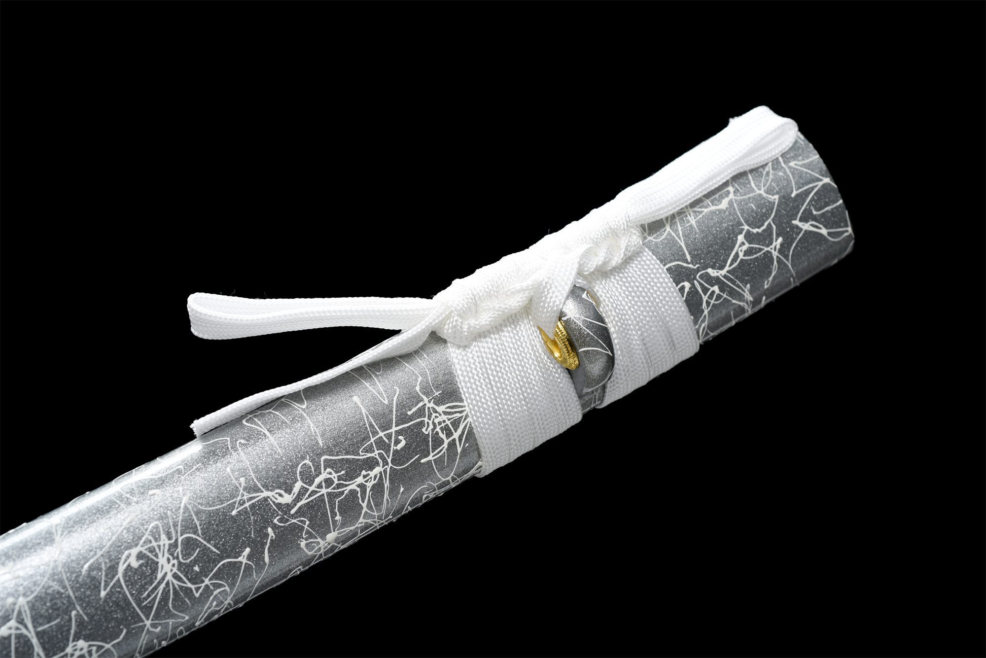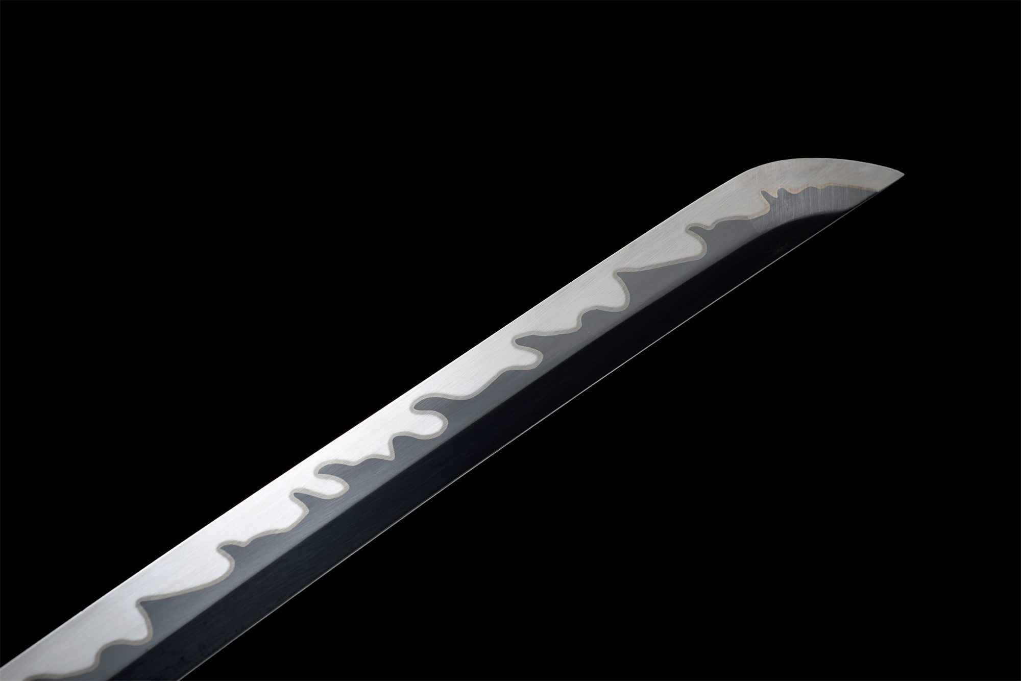 Mangaaniteräksestä valmistetun terän musta grillattu viimeistely kontrastoi kauniisti terän reunassa näkyvän hamon (刃文) kanssa. Tämä erilainen karkaisutekniikka luo silmiinpistävän visuaalisen vaikutelman ja parantaa terän leikkausominaisuuksia. Pyöristetyssä tsubassa on musta ja hopeinen kaiverrettu lohikäärme, joka on japanilaisessa perinteessä voiman ja viisauden symboli. Kahva yhdistää harmonisesti massiivipuuta ja valkoista keinonahkaa, kun taas valkoinen punos (tsuka-ito) muodostaa timanttikuvioita, jotka takaavat tukevan ja tyylikkään otteen. Menuki-koristeet esittävät mustia lohikäärmeitä, jotka muistuttavat näiden legendaaristen olentojen mystisestä voimasta. Massiivinen harmaa lakattu puinen saya on koristeltu hienostuneilla valkoisilla yksityiskohdilla, joita täydentää valkoinen sageo, joka korostaa kokonaisuuden esteettistä yhtenäisyyttä.