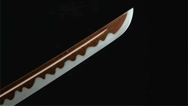 - Tsuba (鍔) kullattu messinkinen suojus, pyöristetty ja aaltojen kaiverrus.