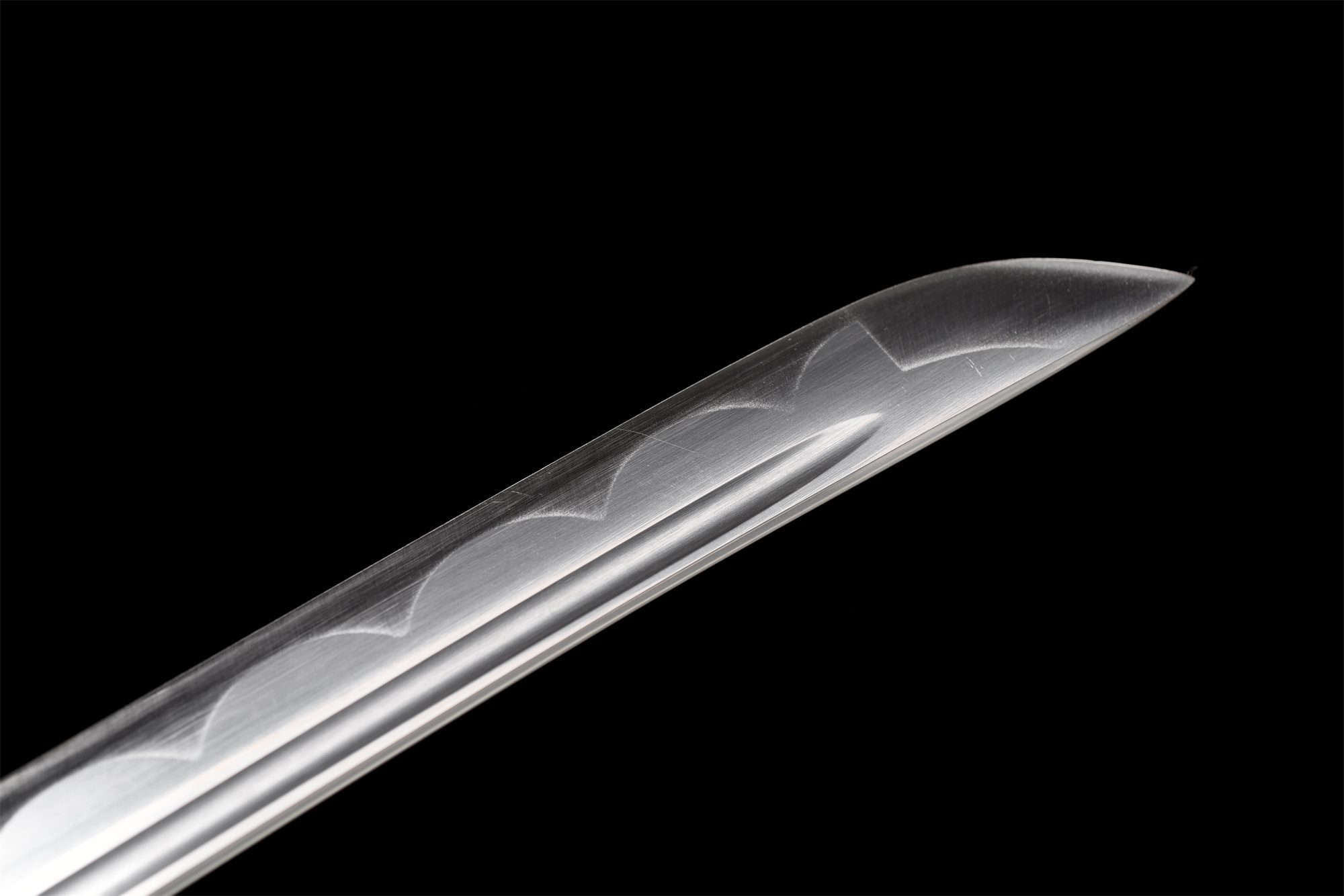 Mangaaniteräksinen terä on viimeistelty luonnollisella teräspinnoitteella, joka paljastaa taotun metallin tekstuurin hienovaraiset vaihtelut. Terässä näkyvä hamon (刃文) on osoitus differentiaalisesta karkaisuprosessista, joka luo tyypillisen aaltoilevan viivan, joka erottaa terän kovan osan pehmeämmästä ytimestä. Ruusupuiset kahvat tarjoavat luonnollisen, lämpimän otteen, kun taas messinkinen habaki luo elegantin siirtymän terän ja kahvan välille. Myös ruusupuisesta valmistettu tuppi jatkaa materiaalien harmoniaa huolellisesti muotoilluilla päillään.
