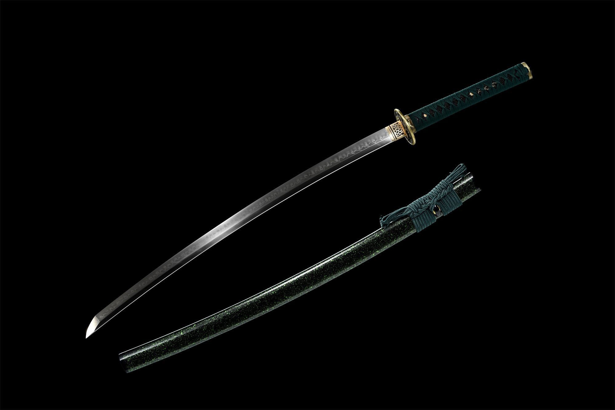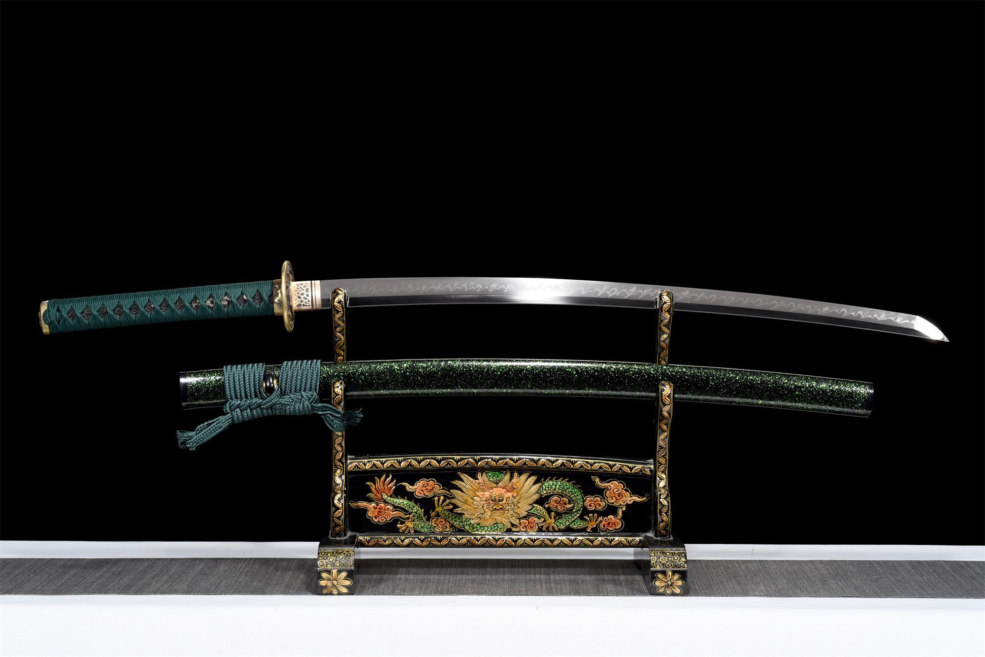 Sen T10-teräksestä valmistetun terän kiillotettu pinta paljastaa upean midare hamonin luonnollisine aaltoiluineen, mikä on todiste aidosta differentiaalisesta karkaisusta. Pyöristetyssä kuparisessa tsubassa on herkät hevoskaiverrukset, jotka viittaavat aseen nimeen. Kahvassa yhdistyvät aito rausku ja vihreä timanttikuvioinen punos, kun taas mustat menuki-koristeet lisäävät eleganttia yksinkertaisuutta. Vasaroidut kupariset fuchi ja kashira toistavat ratsastusaiheisia motiiveja huikealla käsityötaidolla. Kuvioitu lakattu puinen tuppi yhdistää hienovaraisesti mustan ja vihreän, ja sitä täydentävät aito sarvinen koiguchi ja vihreä sageo, joka yhdistää kokonaisuuden.