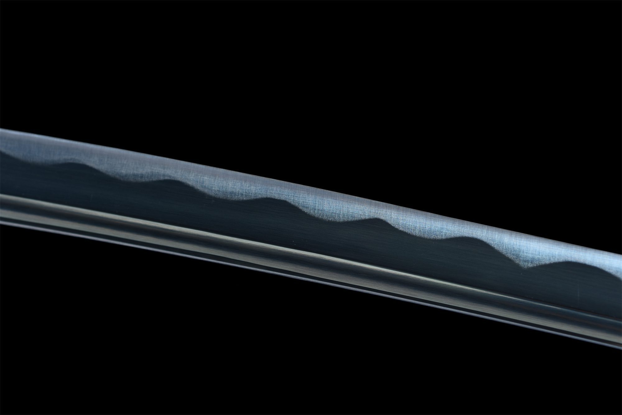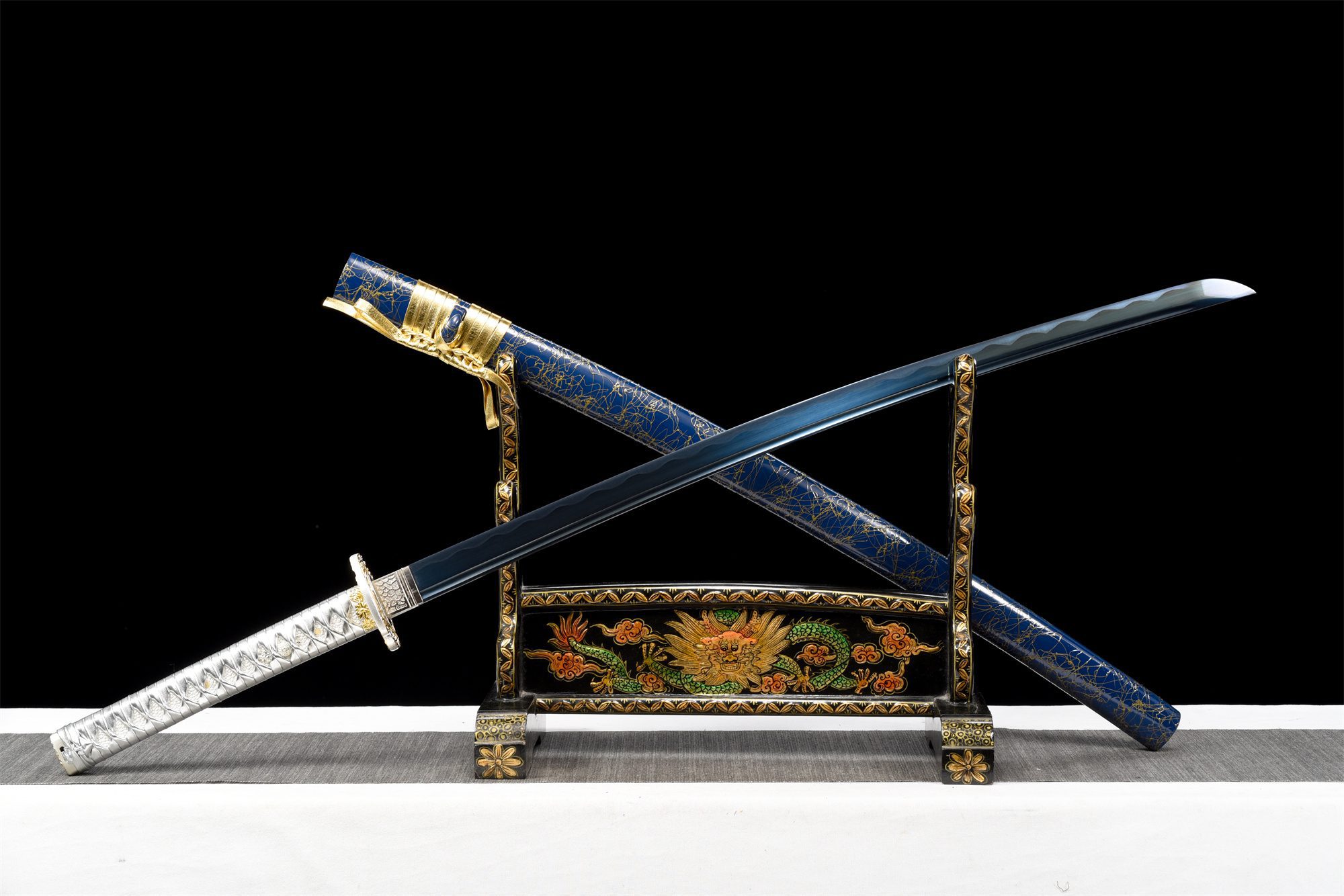 Sen 1060-teräksinen terä on syvän sininen ja heijastaa valoa poikkeuksellisen voimakkaasti, kun taas aito notare hamon (刃文) luo kristallimaisia aaltoja terän reunaan. Bo-hi kaivertaa terän takaosan tyylikkäästi ontoksi, mikä vähentää sen painoa säilyttäen kuitenkin sen rakenteellisen jäykkyyden. Pyöreä ristikkäin muotoiltu tsuba, joka on valmistettu hopeaseoksesta ja koristeltu kultaisilla viimeistelyillä, tuo mieleen taivaalliset ja maalliset symbolit. Kahva yhdistää perinteisen valkoisen tekorauskuahvan ja harmaan tekonahan punoksen, joka muodostaa hienostuneita timanttikuvioita, kun taas hopeiset menuki-koristeet korostavat kahvaa hienostuneilla yksityiskohdilla. Sininen ja kultainen lakattu puinen tuppi sopii täydellisesti yhteen yleisen esteettisyyden kanssa, ja sitä täydentää kultainen nahkainen sageo, joka lisää ripauksen ylellisyyttä.