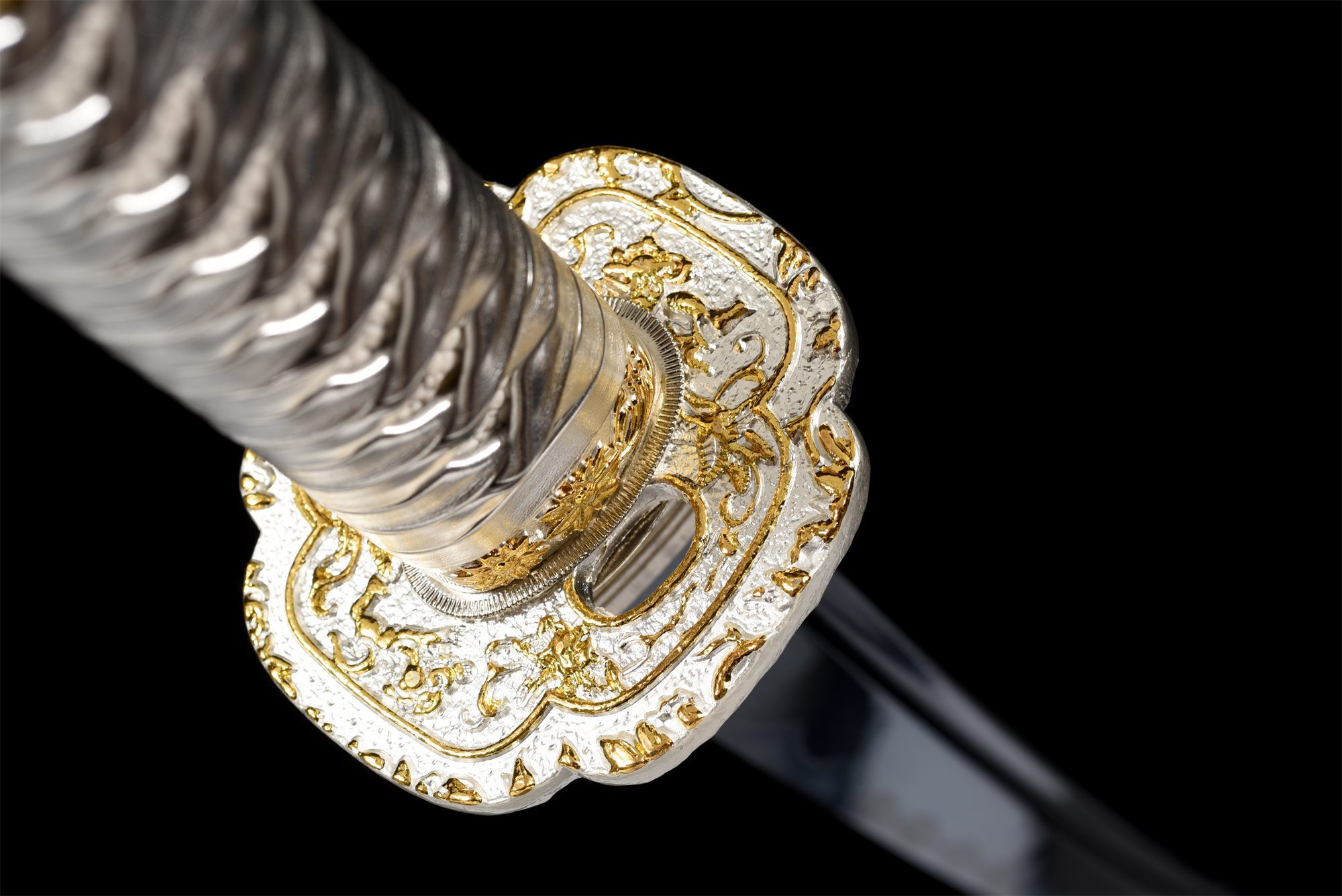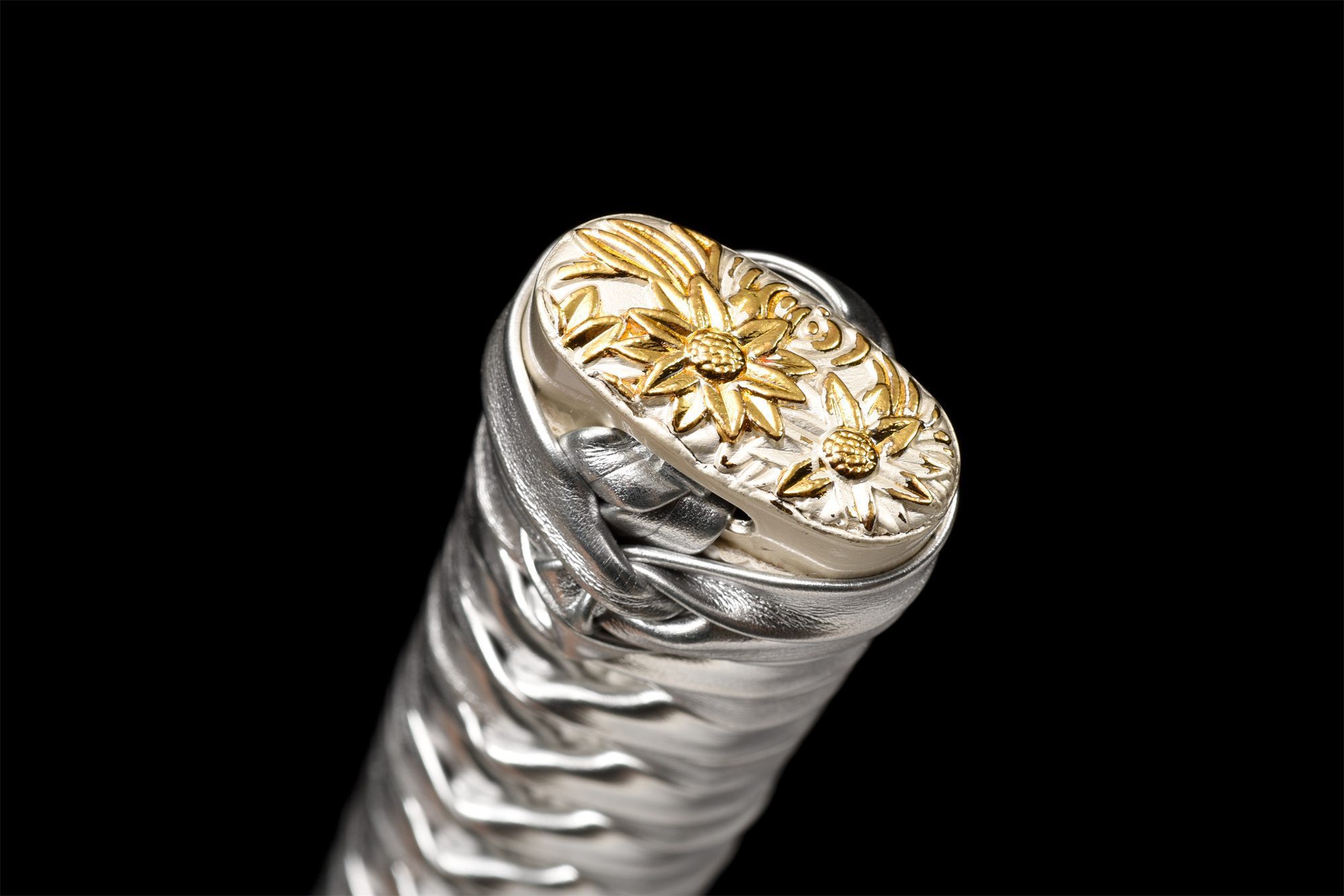 - Kashira (頭): Hopeaseos kullatulla viimeistelyllä ja kukkakuvioilla.