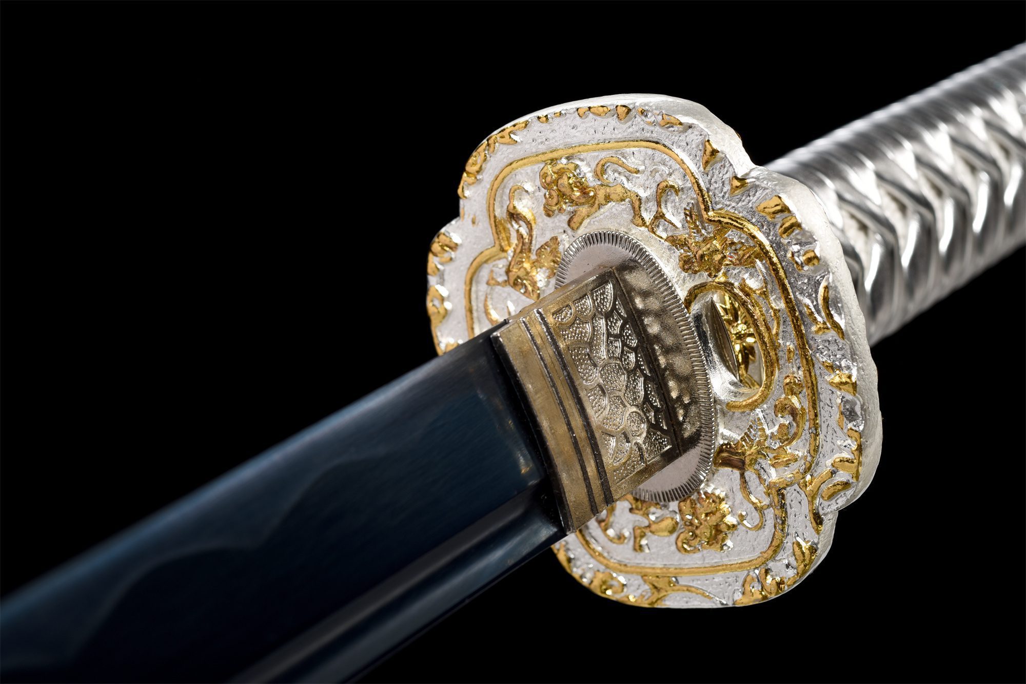 - Fuchi (縁): Hopeaseos kullatulla viimeistelyllä ja kukkakuvioilla.