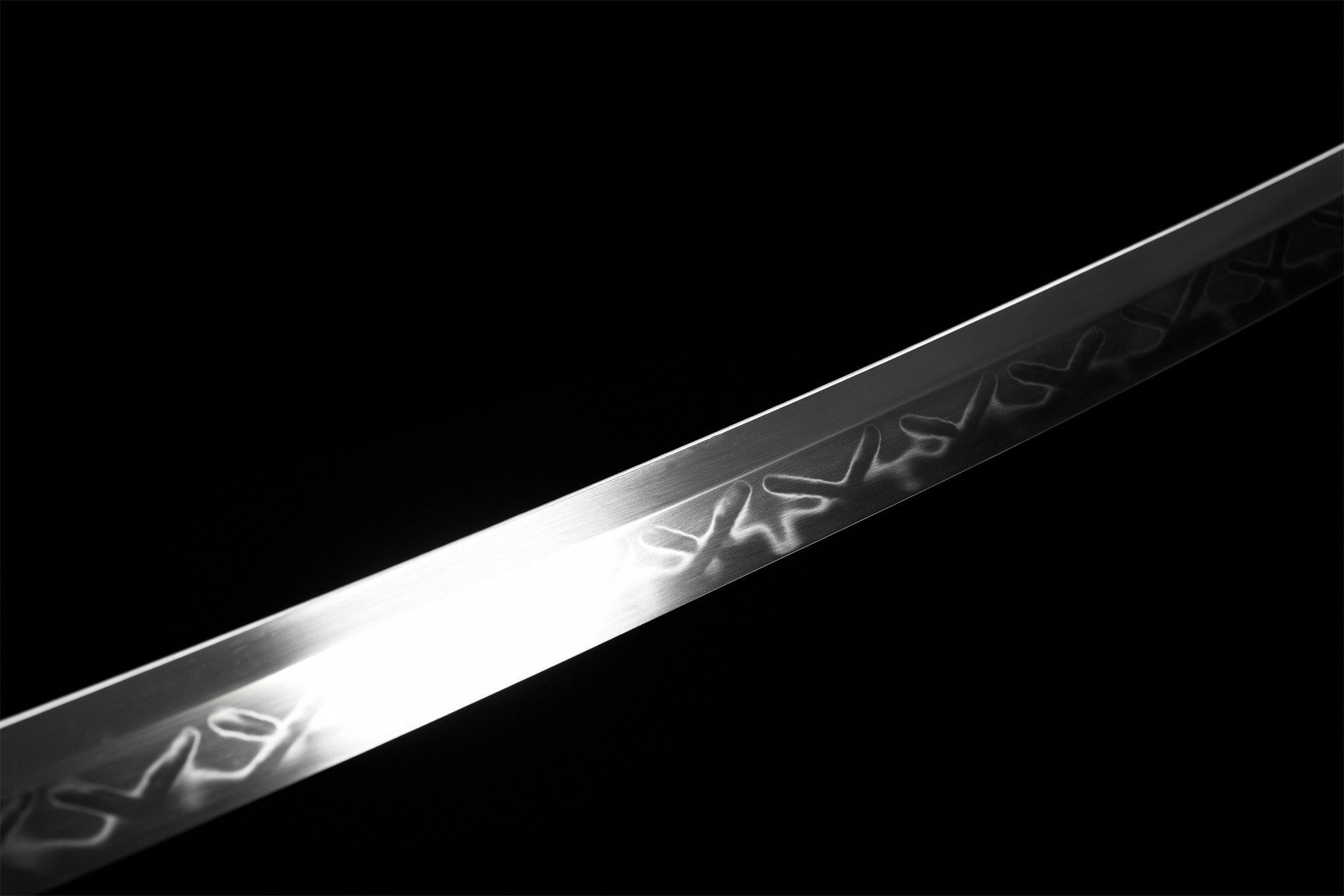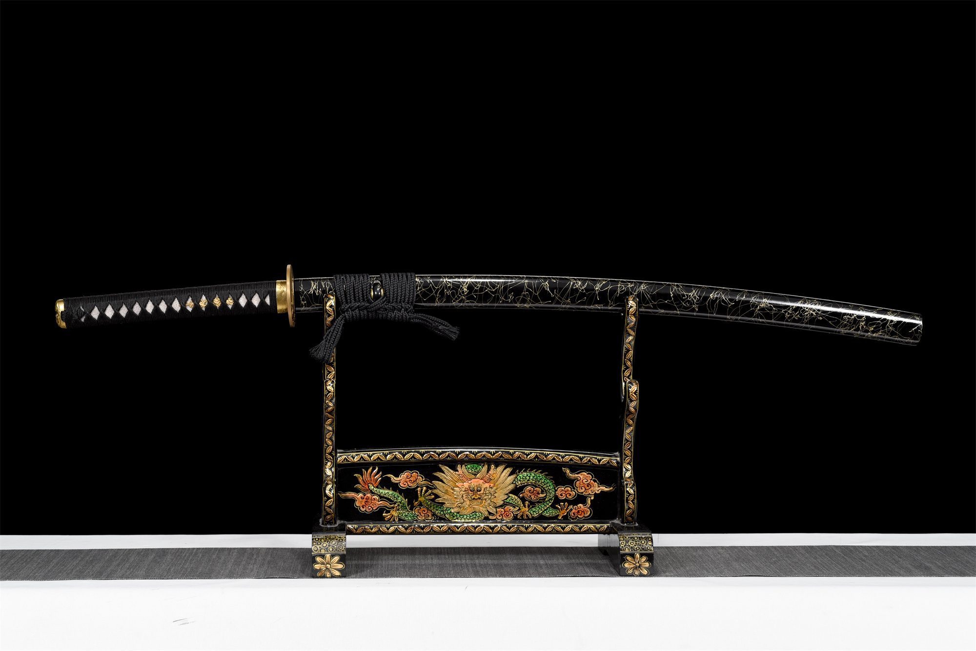 Sen T10-teräksinen terä on peilikiillotettu, ja sen pinnalla näkyy aito choji hamon (刃文), jossa on kauniita aaltoja, jotka ovat syntyneet hallitun differentiaalisen karkaisun tuloksena. Tämä käärmeenmuotoinen karkaisulinja on osoitus esi-isien käsityötaidosta ja antaa jokaiselle katanalle ainutlaatuisen leiman. Pyöristetty tsuba kullatusta kuparista on huolellisesti vasaroitu ja kaiverrettu, ja sitä täydentää kozuka-hitsu, joka parantaa sen toiminnallisuutta. Kahvassa yhdistyvät aito rausku nahka ja musta timanttikuvioinen punos, kun taas menuki-koristeissa on hienosti veistetyt kultaiset lohikäärmeet. Kullatusta kuparista valmistetut fuchi ja kashira sopivat täydellisesti yhteen, jälkimmäinen on koristeltu perinteisellä aaltojen symbolilla. Musta lakattu puinen tuppi on koristeltu hienovaraisilla kultaisilla säikeillä, jotka luovat silmiinpistävän kontrastin aitoa sarvea olevaan koiguchiin.