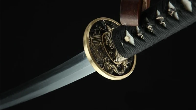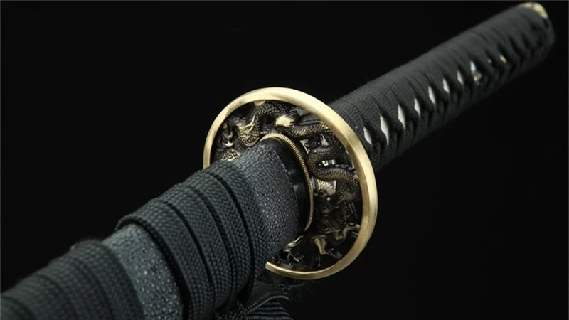 - Tsuba (鍔): pyöristetty messinkinen suojus, johon on kaiverrusta lohikäärme.