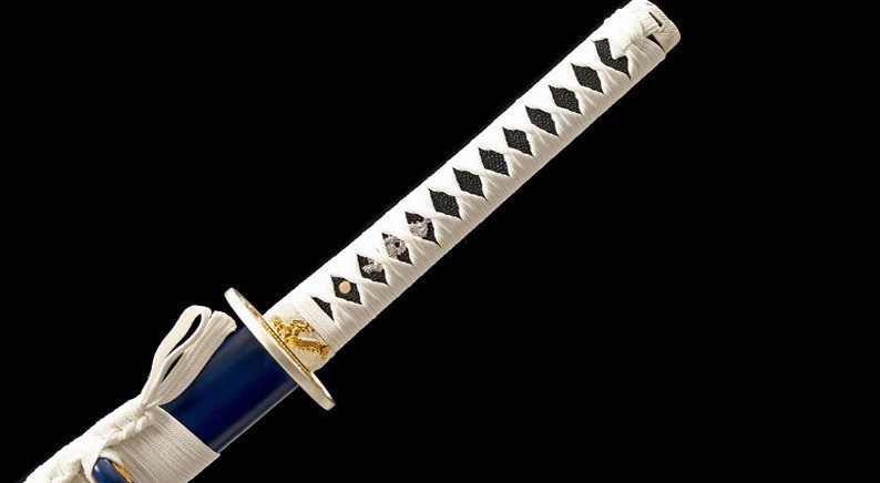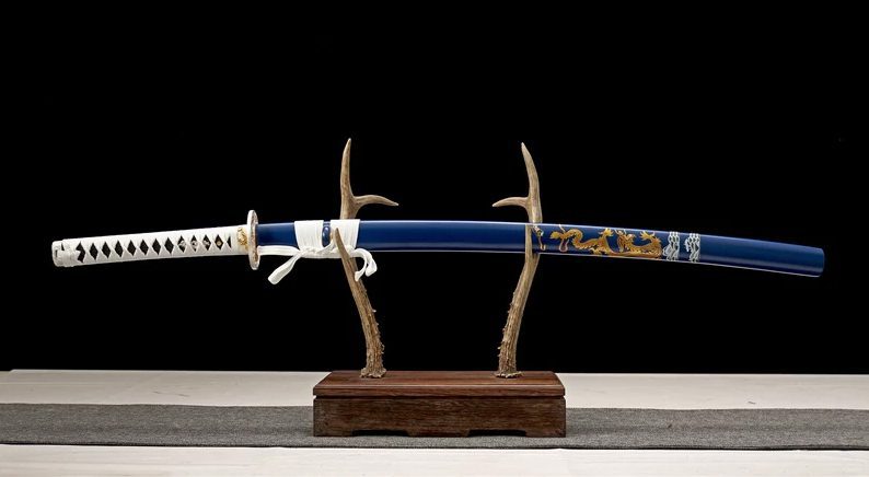 Tämä Lohikäärme Katana, jossa on käsin taottu T10-teräksinen terä, on saatavana teroituksella. Sininen puinen tuppi on koristeltu kultaisella lohikäärmellä, joka lentää aaltojen yli. Kovapuinen ja musta PU Samegawa -kahva tarjoaa mukavan otteen. Sitä ympäröi valkoinen Tsuka-ITO, joka on kudottu timanttimuotoon, paljastaen mustan PU Samegawan ja veistetyn valkoisen Menukin.