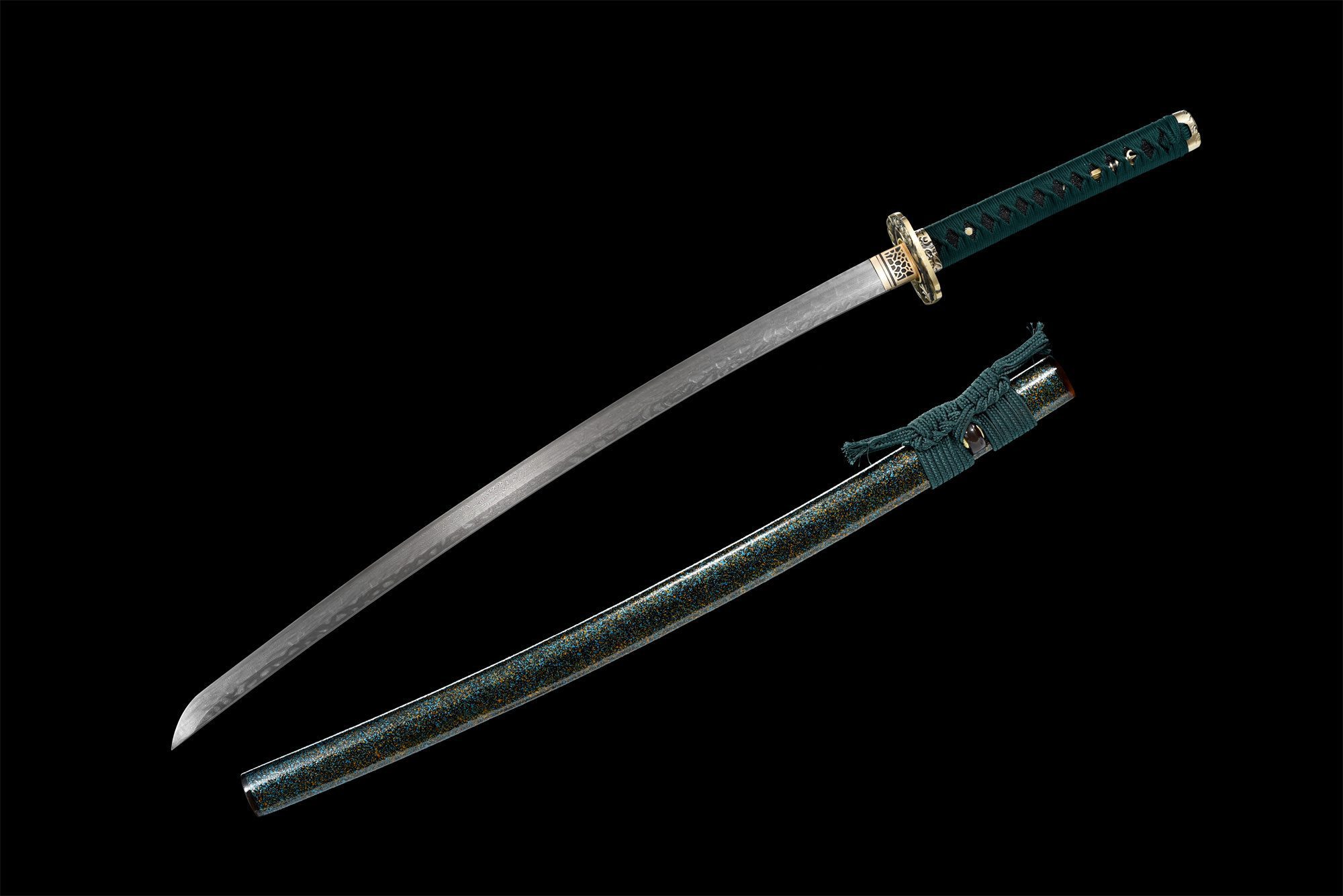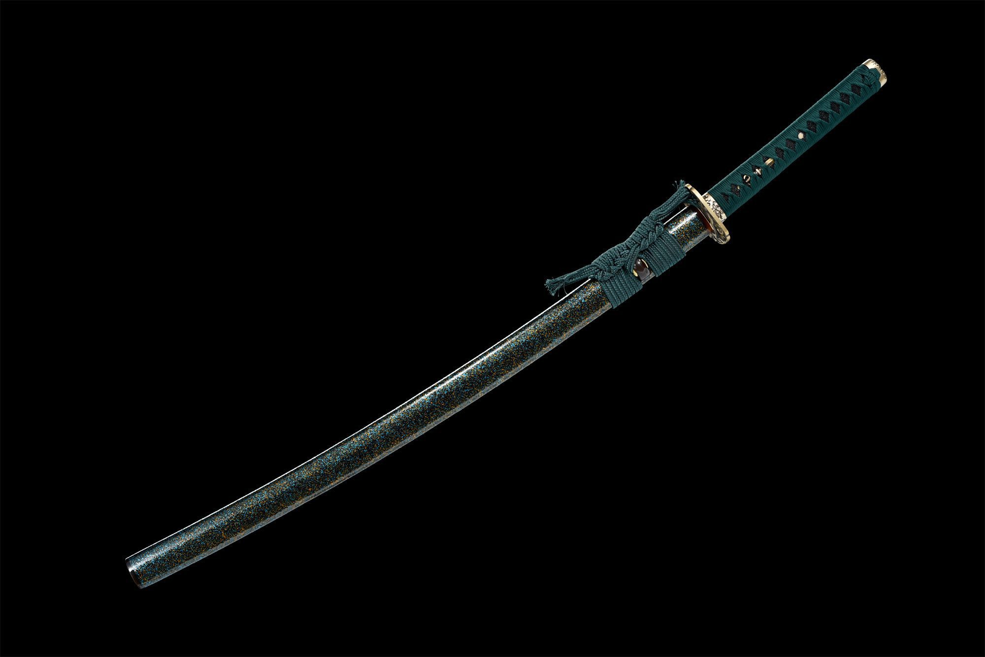 - Tsuka-ITO (柄糸): Vihreä punottu timanttikuvio kahvan yläpuolella.