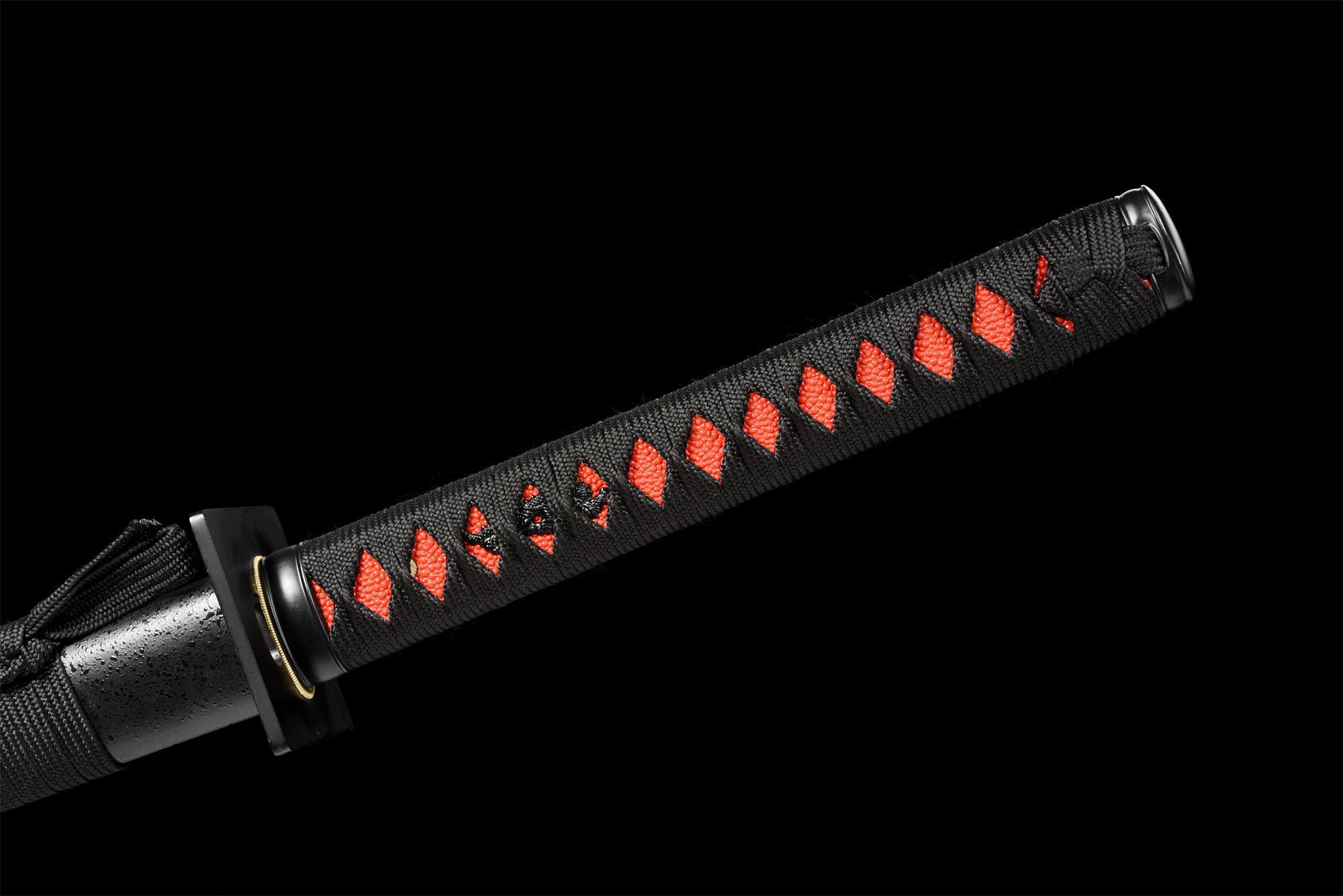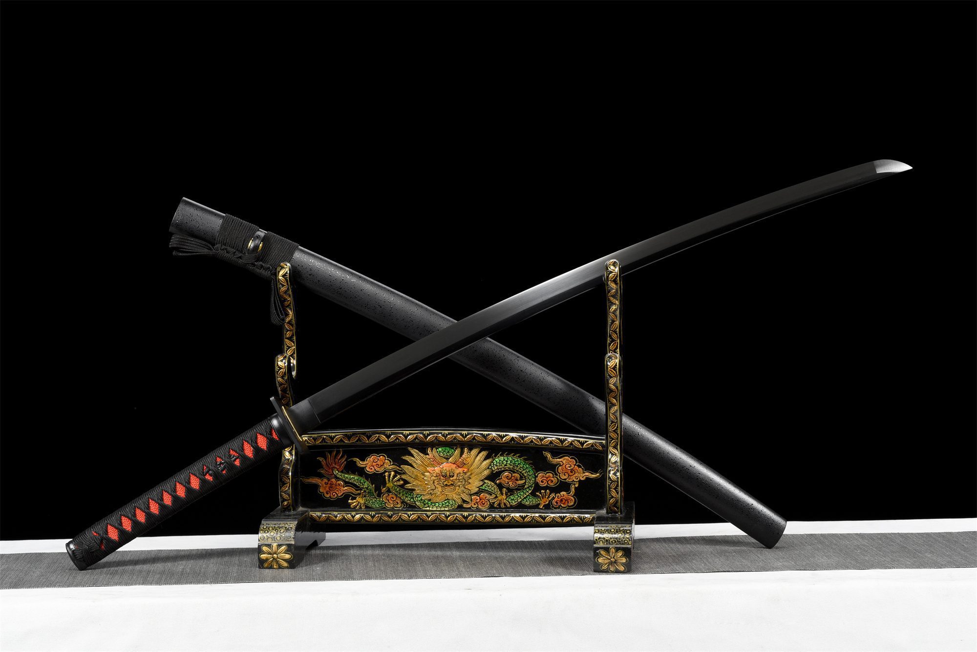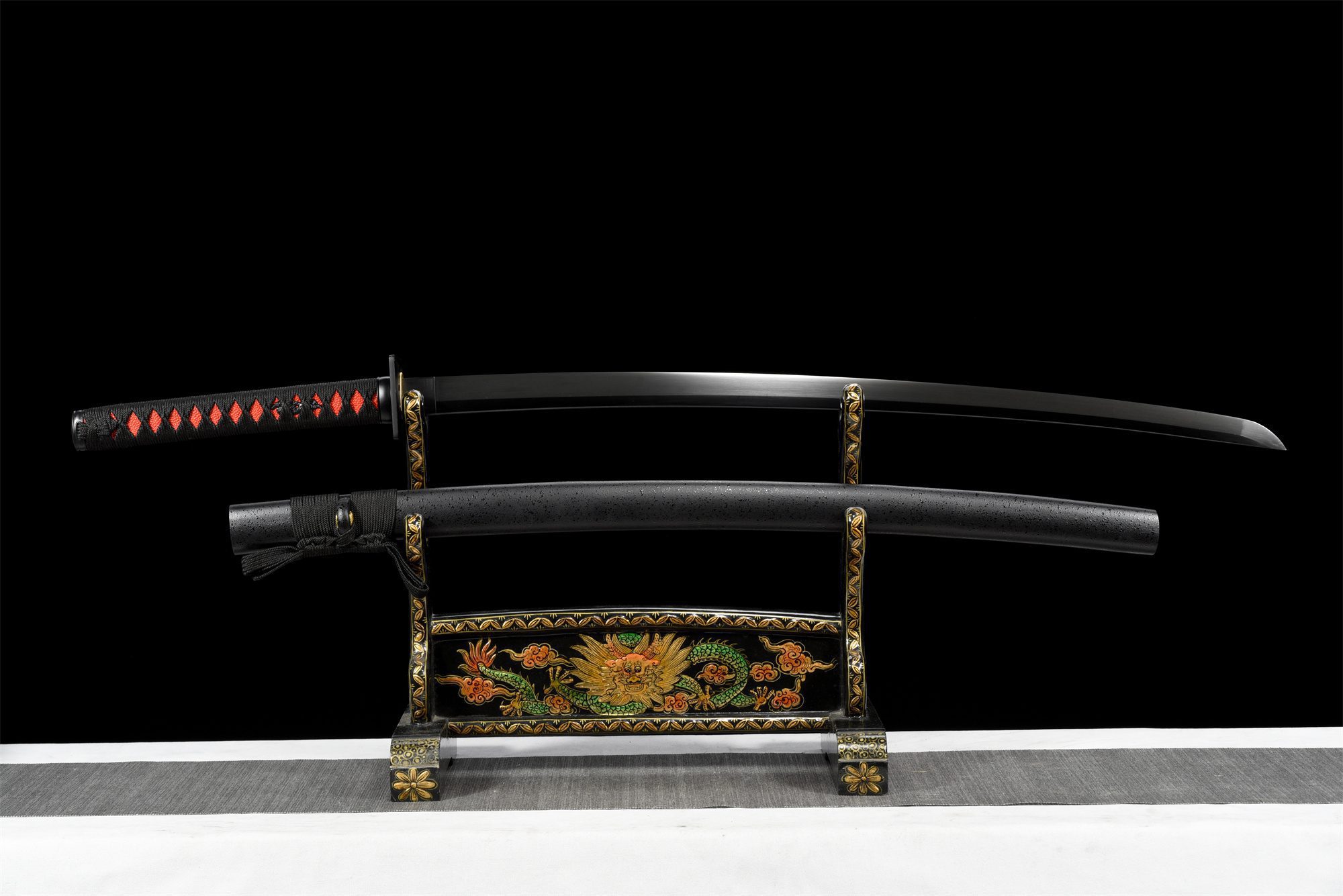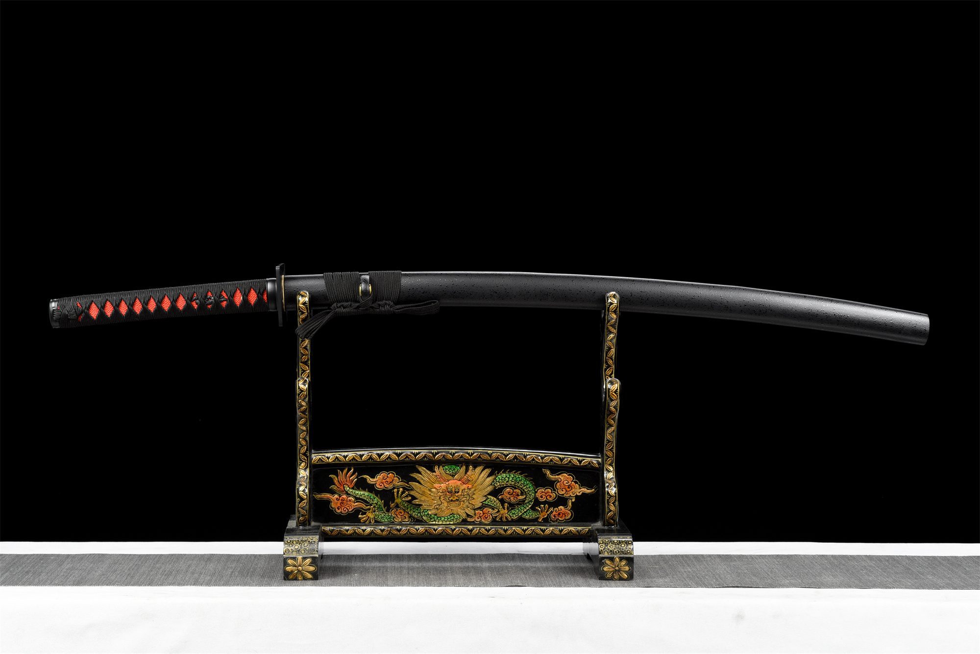 Sen musta 1060-teräksinen terä tarjoaa poikkeuksellisen lujuuden säilyttäen samalla taistelussa tarvittavan joustavuuden. Sen mattapinta imee valoa ja antaa aseelle vaikuttavan ulkonäön. Neliönmuotoinen musta metalliseoskaulus (tsuba) täydentää täydellisesti tätä yksiväristä estetiikkaa, kun taas sen geometriset linjat lisäävät hienovaraisen modernin vivahteen. Kahva (tsuka) yhdistää harmonisesti punaisen rauskuhain nahan ja puun, luoden silmiinpistävän kontrastin mustan timanttikuvioisen punoksen (tsuka-ito) kanssa. Mustia lohikäärmeitä esittävät menuki-koristeet vahvistavat kokonaisuuden mystistä luonnetta, kun taas sileästä mustasta metalliseoksesta valmistetut fuchi ja kashira ylläpitävät esteettistä yhtenäisyyttä. Musta lakattu puinen tuppi (saya) heijastaa perinteistä japanilaista eleganssia, jota täydentää musta sageo, joka korostaa teoksen yleistä yksinkertaisuutta.