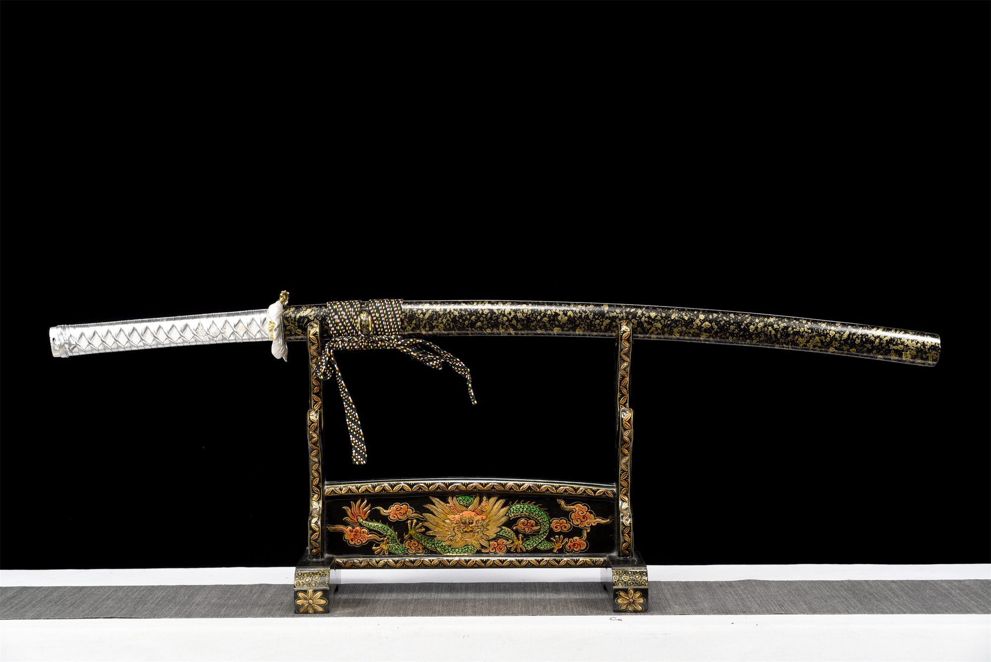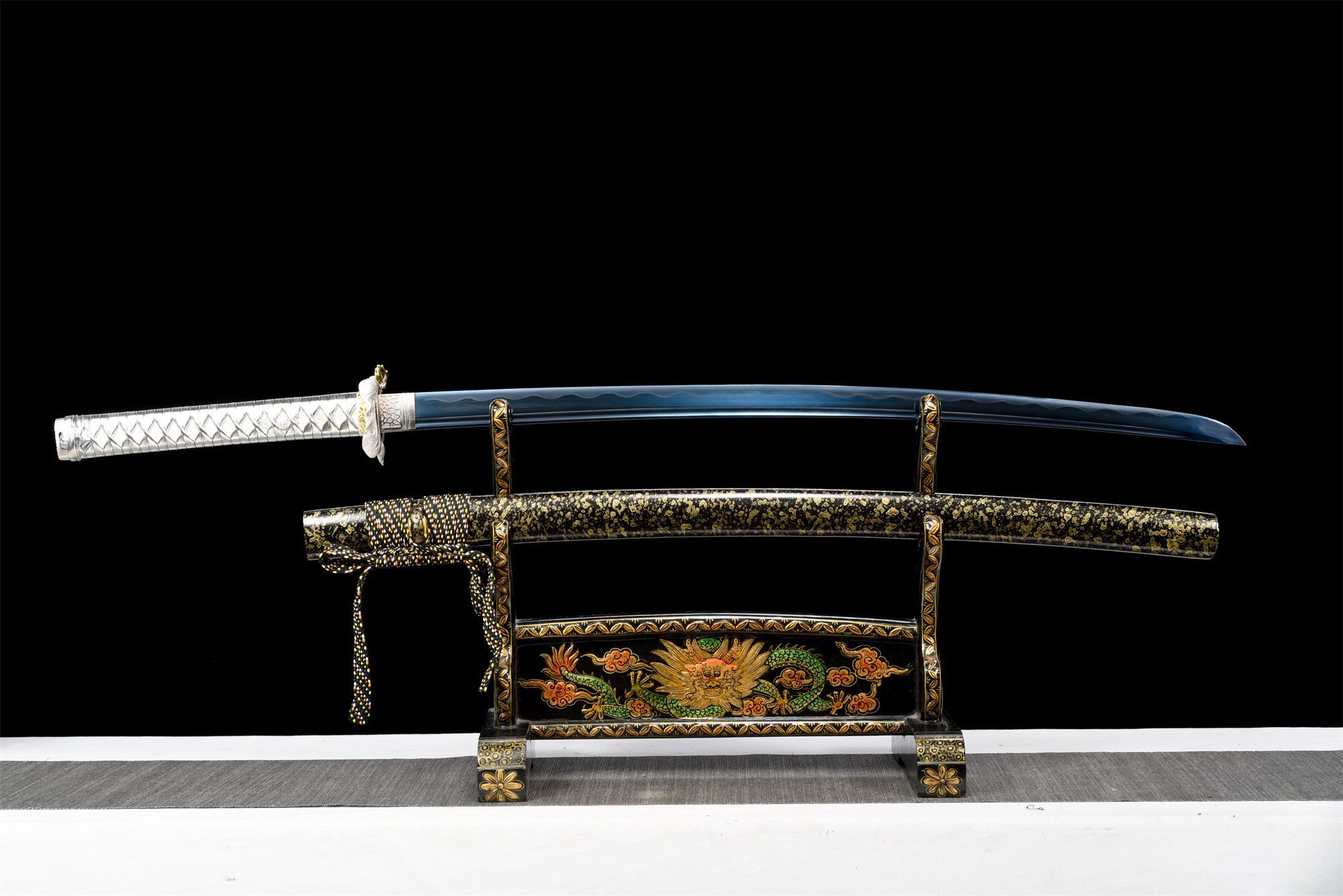 - Tuppi (Saya 鞘): Musta lakattu puu, koristeltu kultaisilla vesipisaroilla.