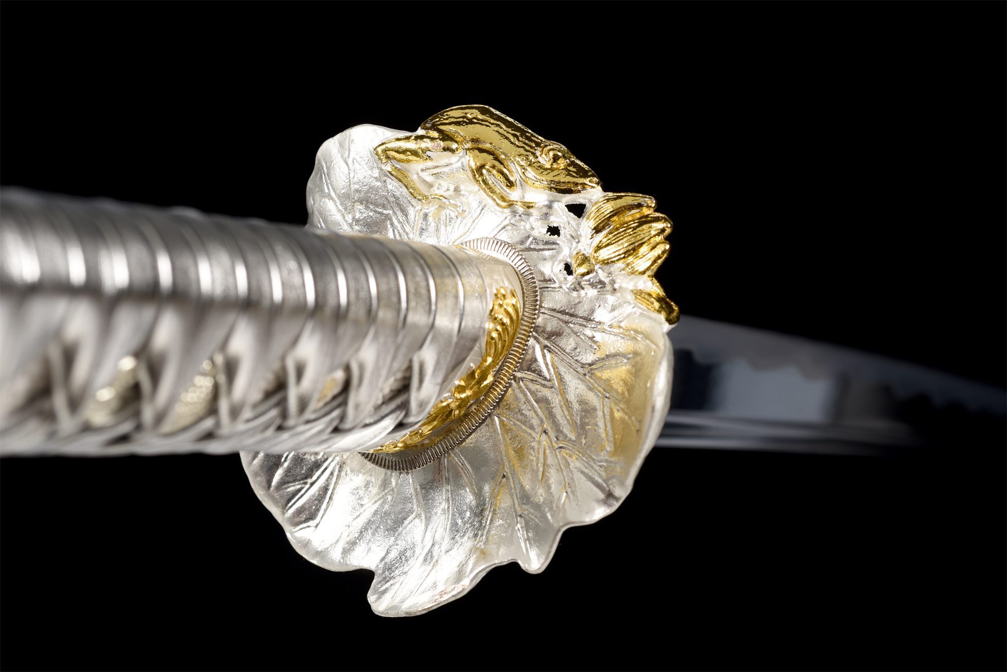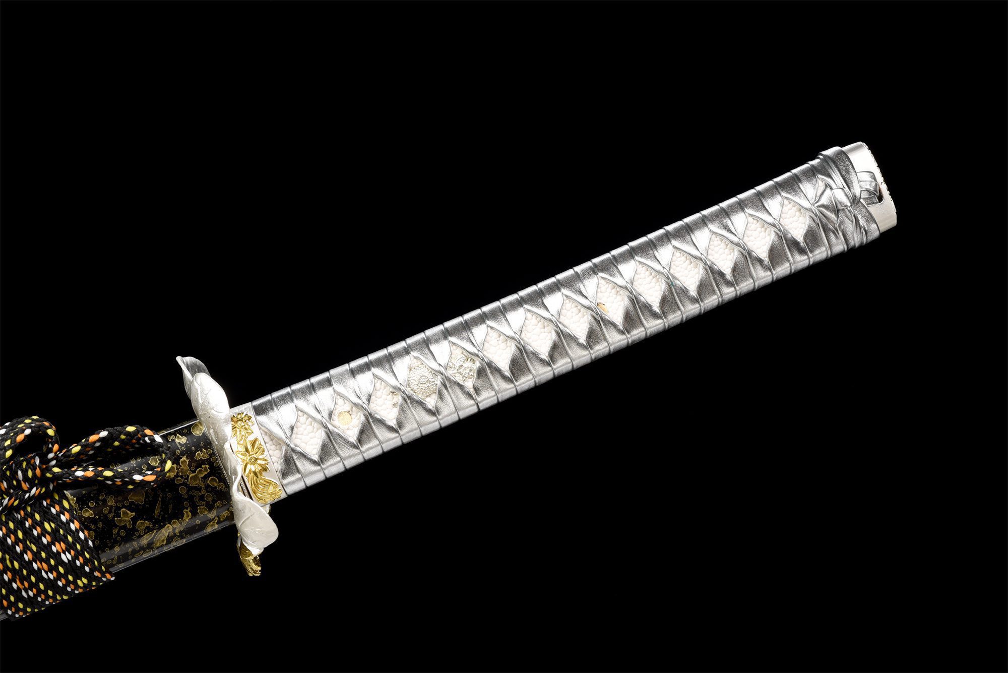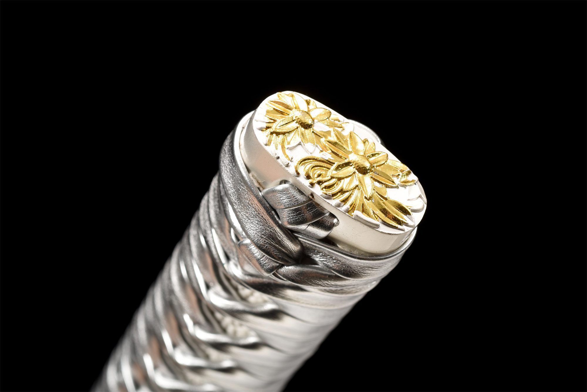 - Kashira (頭): Hopeaseos, koristeltu kultaisilla kukilla.