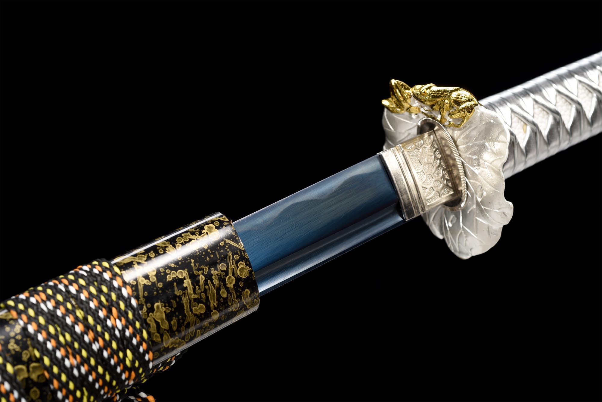 - Suojus (Tsuba 鍔): Hopeinen lehtikuvio, jossa kultainen sammakko.