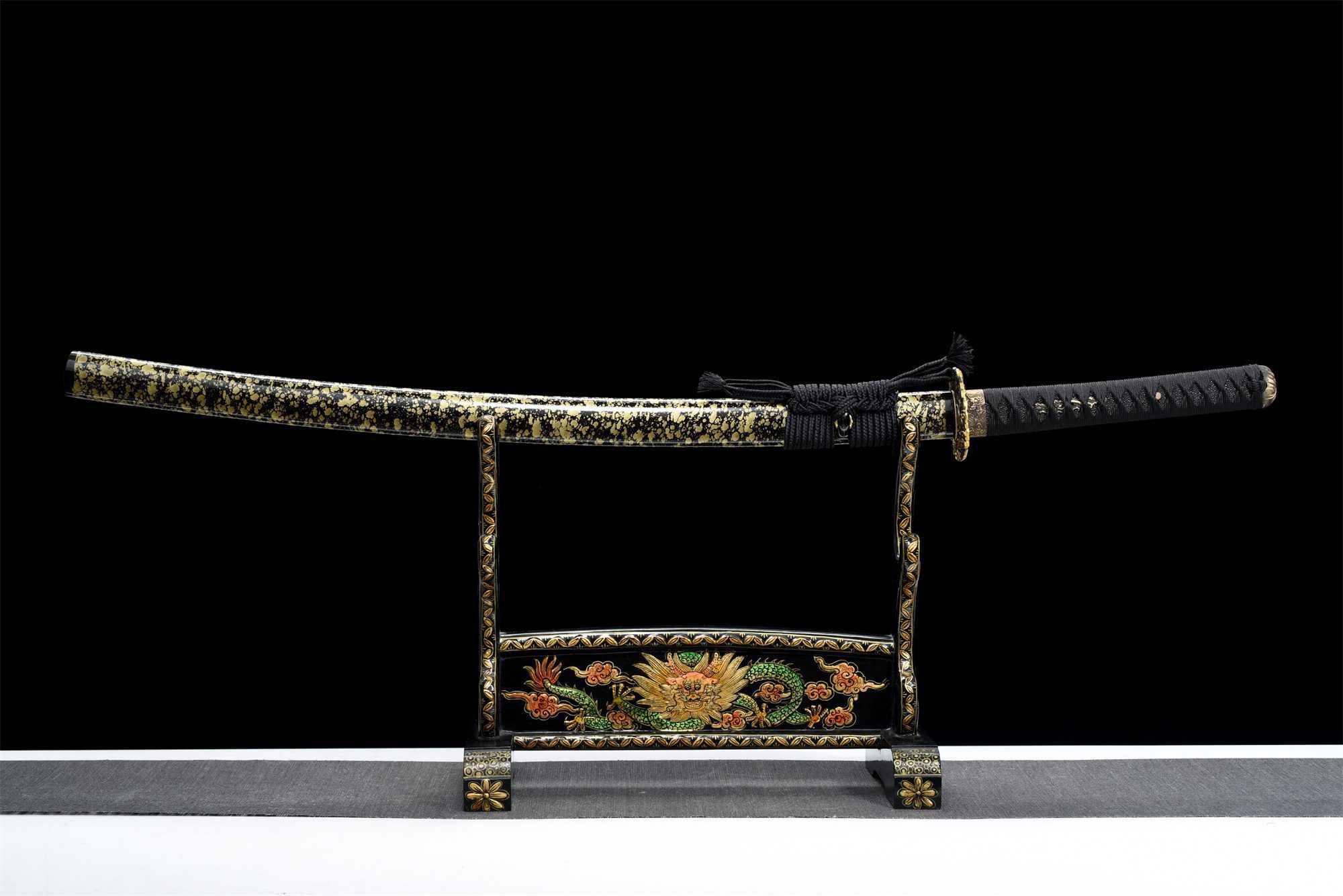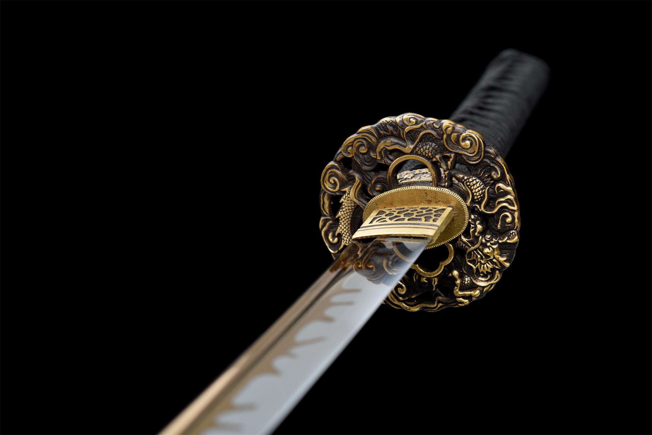 Mangaaniteräksestä valmistetun terän silmiinpistävä kultainen viimeistely kontrastoi kauniisti terän reunassa näkyvän hamon (刃文) kanssa. Kultainen sävy antaa aseelle ylellisen ulkonäön säilyttäen samalla sen toiminnalliset ominaisuudet. Pyöreä tsuba, joka on valmistettu kullasta ja mustasta kuparista, on koristeltu tuulen ja aaltojen motiiveilla, jotka symboloivat liikkeen sujuvuutta ja luonnollista voimaa. Mustaa keinonahkaa peittävä massiivipuinen kahva tarjoaa vakaan otteen, kun taas mustalla timanttikuvioisella tsuka-itolla punottu kahva parantaa otetta. Menuki edustaa kultaista lohikäärmettä, myyttistä olentoa, joka liittyy viisauteen ja voimaan, ja lohikäärmeen pään muotoon veistetty kashira täydentää harmonisesti kokonaisuuden. Musta ja kultainen massiivipuinen tuppi sopii täydellisesti yleiseen estetiikkaan ja luo silmiinpistävän kontrastin, joka korostaa jokaista yksityiskohtaa.