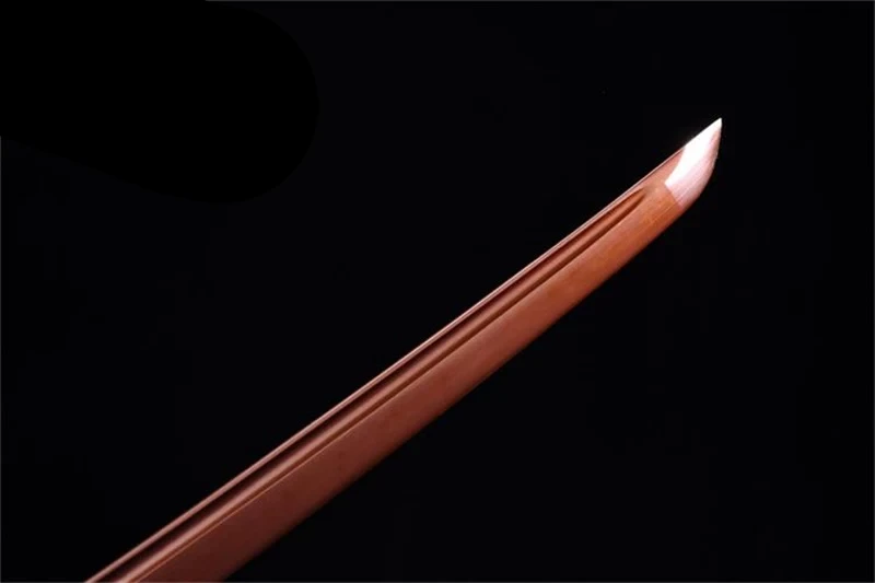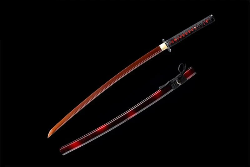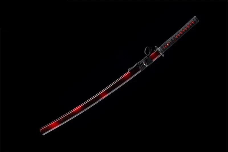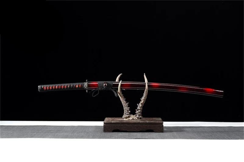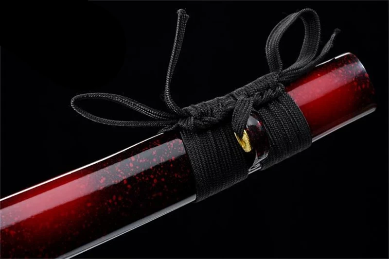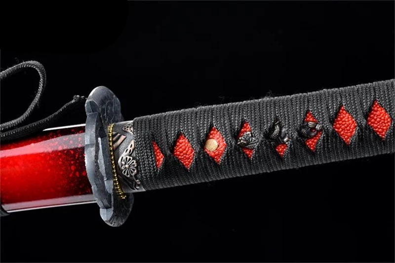 Tämä punainen ja musta katana, jonka mestarimiekkailijamme ovat valmistaneet huolellisesti, on esteettisesti upea. Punaisella T10-teräksellä valmistetun terän bohi-ura on rikas sävy, jota huolellisesti kaiverrettu ja ontto rautakaulus korostaa harmonisesti. PU-punaisella samegawalla päällystetty tsuka on kääritty punottuun mustaan tsuka-itoon, ja sen alaosassa on musta metallinen pommel, jota koristaa kukkakuvio.