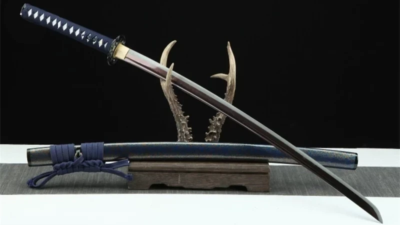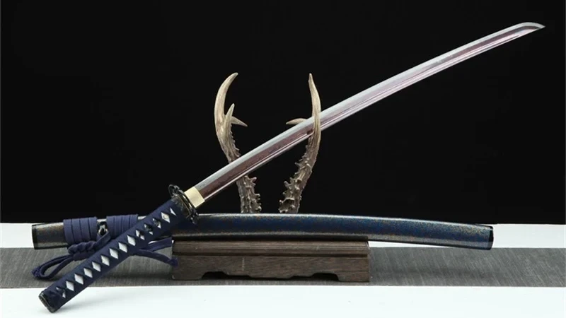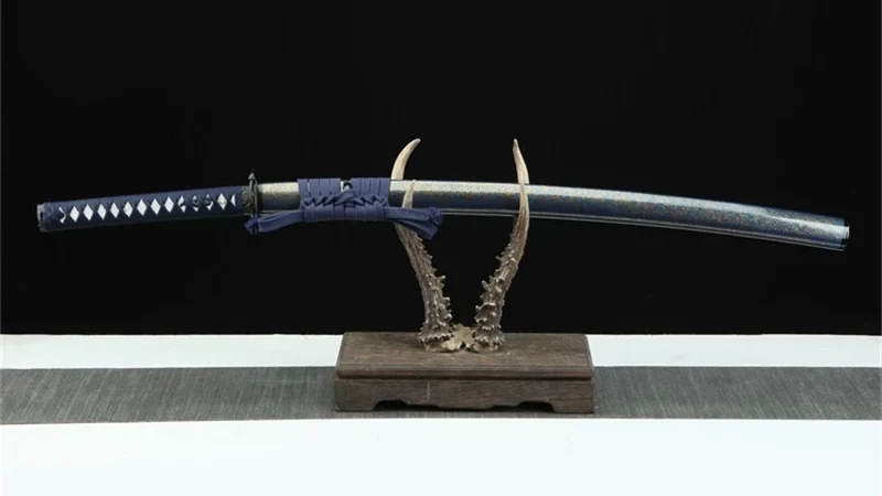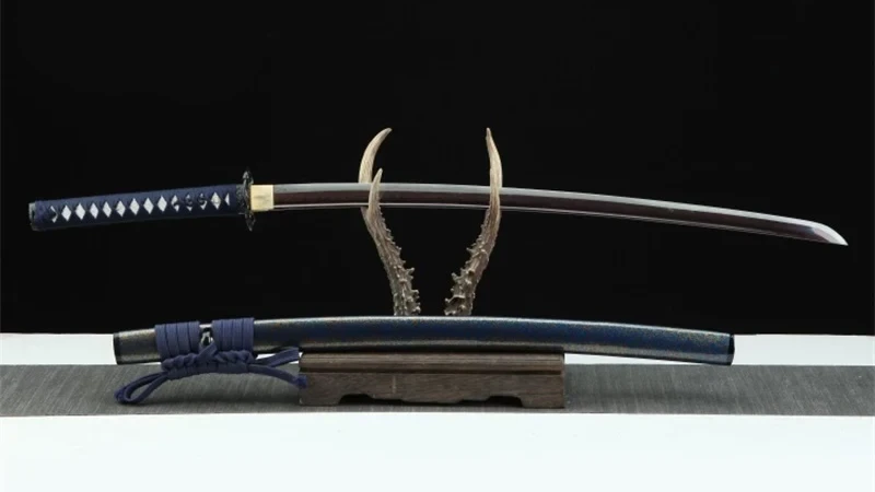 Ruri- eli Lapislatsuli -katana-miekka on varustettu damaskusteräksellä, jonka terä on kiehtovissa sinisen ja punaisen sävyissä. Ontto, nelilehtinen apilanmuotoinen suojus lisää miekkaan ainutlaatuisen, elegantin vivahteen ja tarjoaa erinomaisen otteen. Valkoisella rauskujen nahalla päällystetty kahva on ympäröity sinisellä timanttikuviolla, joka tarjoaa sekä mukavuutta että esteettistä vetovoimaa. Mustilla lohikäärmemotiiveilla koristeltu menuki lisää katanaan mystistä ulottuvuutta, kun taas mustat Fuchi ja Kashira, joihin on kaiverrettu herkät kukat, täydentävät tämän mestariteoksen täydellisesti. Lopuksi Ruri on sijoitettu rakeiseen siniseen lakattuun puutuppiin, joka kiinnitetään vyötärölle paksulla sinisellä Sageolla, joka muistuttaa jälleen tämän älykkyyttä symboloivan sinisen kiven väreistä.