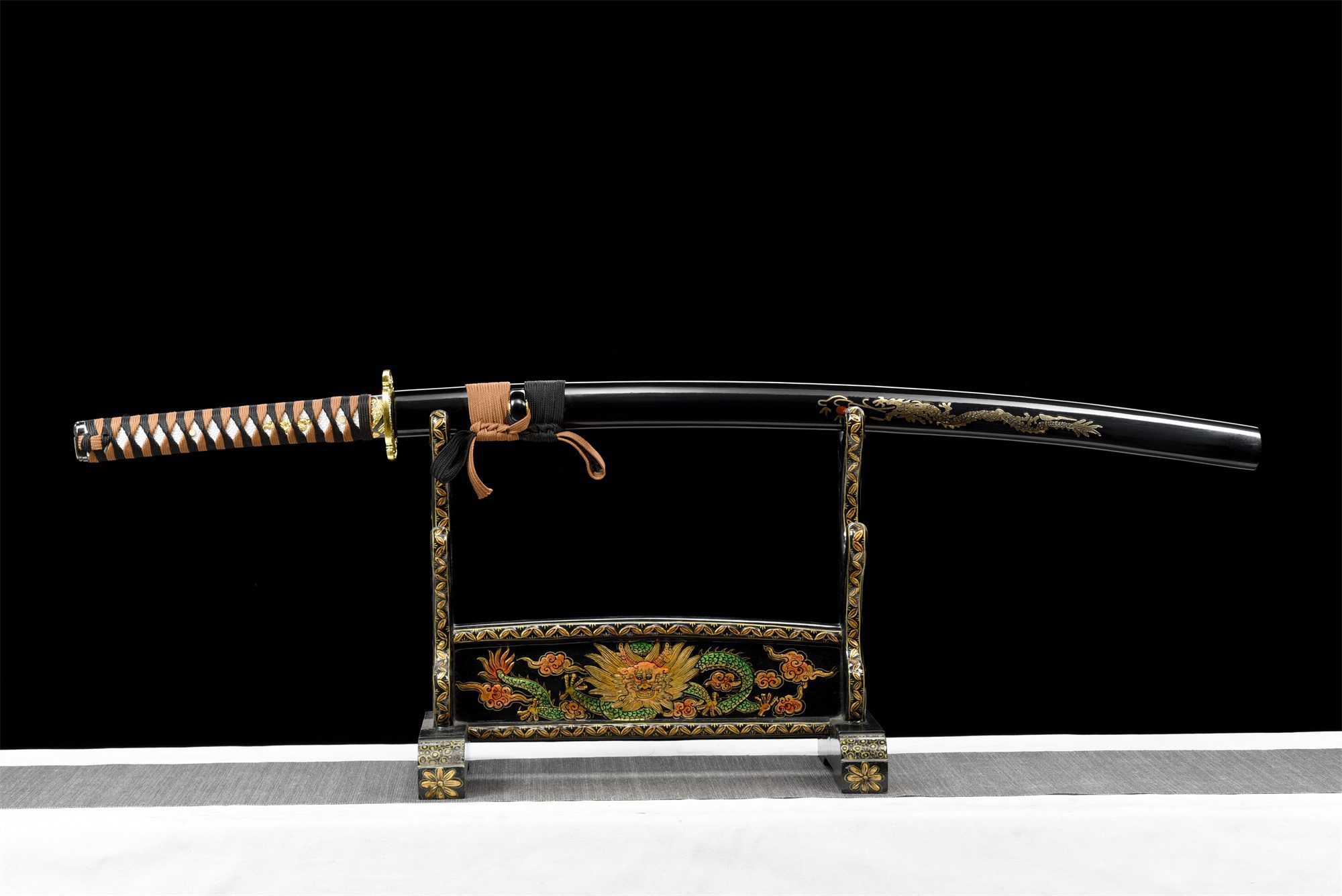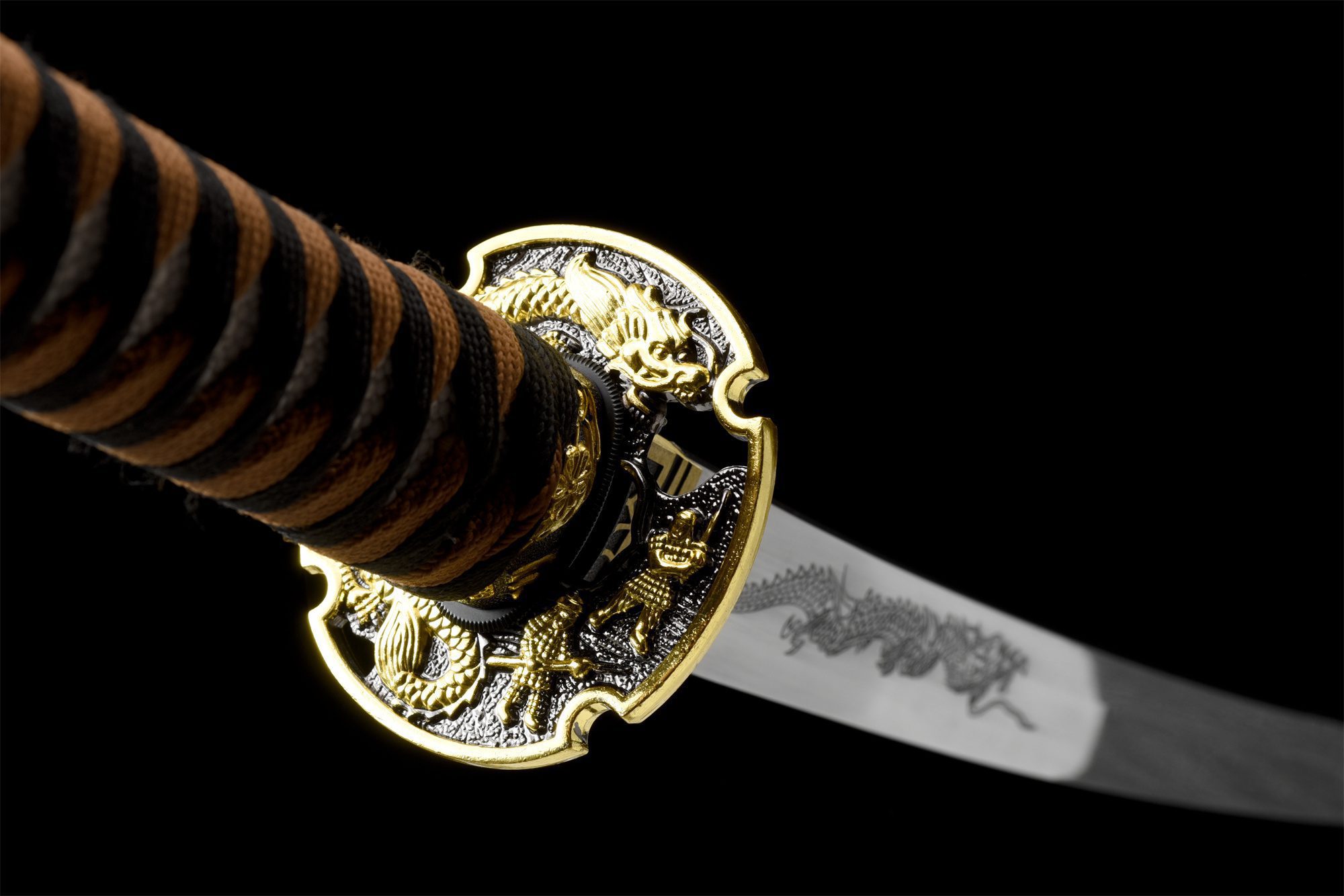 Mangaaniteräksiseen terään on kaiverrettu lohikäärme, joka kiemurtelee elegantisti pinnan poikki ja korostaa käsityöläistemme poikkeuksellista ammattitaitoa. Pyöristetty tsuba-ristisuoja, joka on valmistettu kullatusta ja mustasta metalliseoksesta, on koristeltu hienosti veistetyllä lohikäärmeellä, joka ympäröi suojan ja luo harmonisen siirtymän terään. Kahva (tsuka) yhdistää perinteisen valkoisen keinonahkaisen rauskun ja jalopuun, kun taas ruskea ja musta punos (tsuka-ito) muodostaa timanttikuvion, joka tarjoaa turvallisen ja esteettisen otteen. Kultaiset menuki-koristeet viimeistelevät kokonaisuuden hienostuneesti. Mustaksi lakattu puinen tuppi (saya) on koristeltu kultaisella lohikäärmellä, joka toistuu terän kaiverrus ja yhdistää tämän poikkeuksellisen teoksen esteettisen kokonaisuuden.