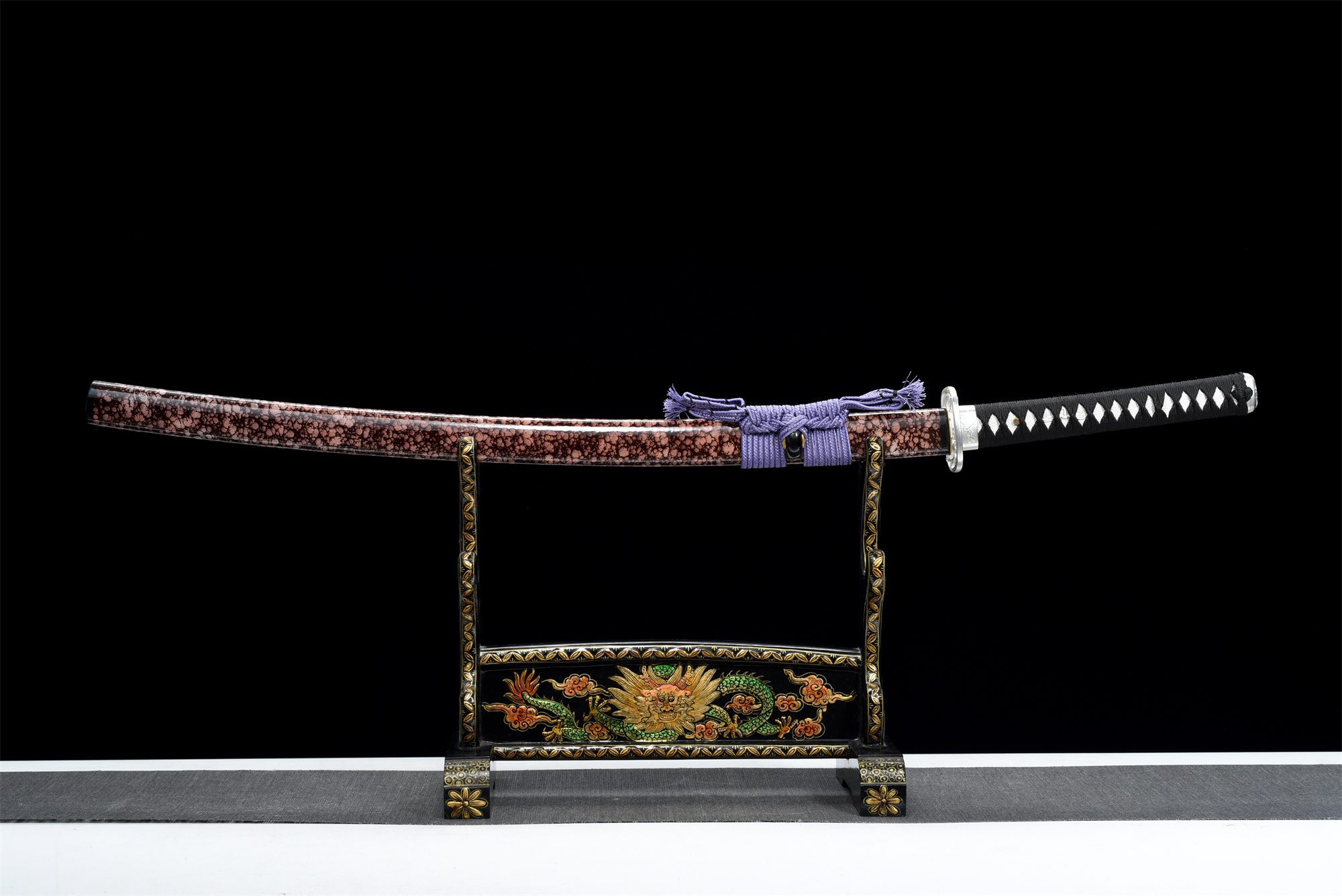 Mangaaniteräksinen terä on lumoavan sininen, mikä muistuttaa merenpohjan vaihtelevia heijastuksia, kun taas hienovarainen hamon (刃文) tuo mieleen vedenalaisten virtausten sulavat liikkeet. Neliönmuotoinen, pyöristetyt reunat omaava tsuba on hienosti hopeoitu ja siinä on kauniisti kaiverretut sudenkorento-motiivit, jotka luovat runollisen kontrastin veden ja ilmassa elävän hyönteisen välillä. Valkoisella keinonahalla päällystetty massiivipuinen kahva tarjoaa tukevan ja mukavan otteen, kun taas tsuka-iton musta timanttikuvioinen punos lisää hienostuneen geometrisen vivahteen. Valkoista lohikäärmettä esittävät menuki-koristeet symboloivat syvyyksissä uinuvan hengellisen voiman. Musta ja vaaleanpunainen massiivipuinen saya muistuttaa aamunkoittoa, joka murtautuu pimeän veden pinnan läpi, ja sitä täydentää violetti sageo, joka muistuttaa syvyyden hämärän sävyjä.