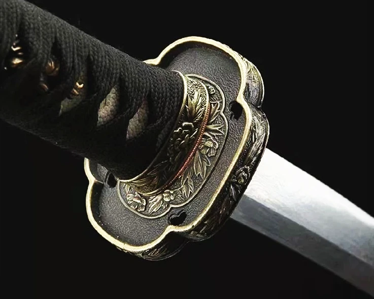 - Tsuba (鍔): ristinmuotoinen, kullattu ja kaiverrettu ääriviiva, musta sisäpuoli, jossa kukkakuvioita habakin ympärillä, kuparinen sepa.