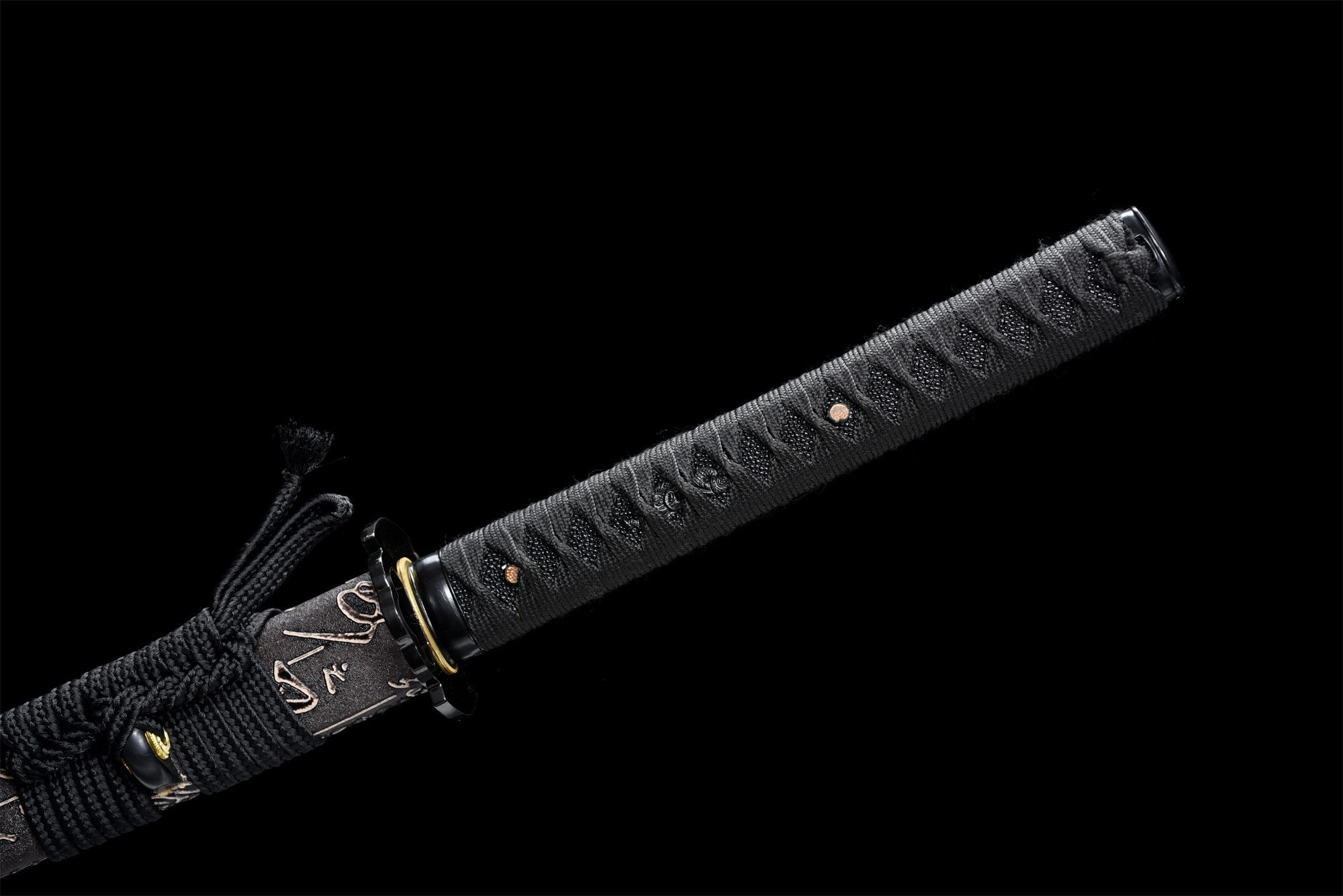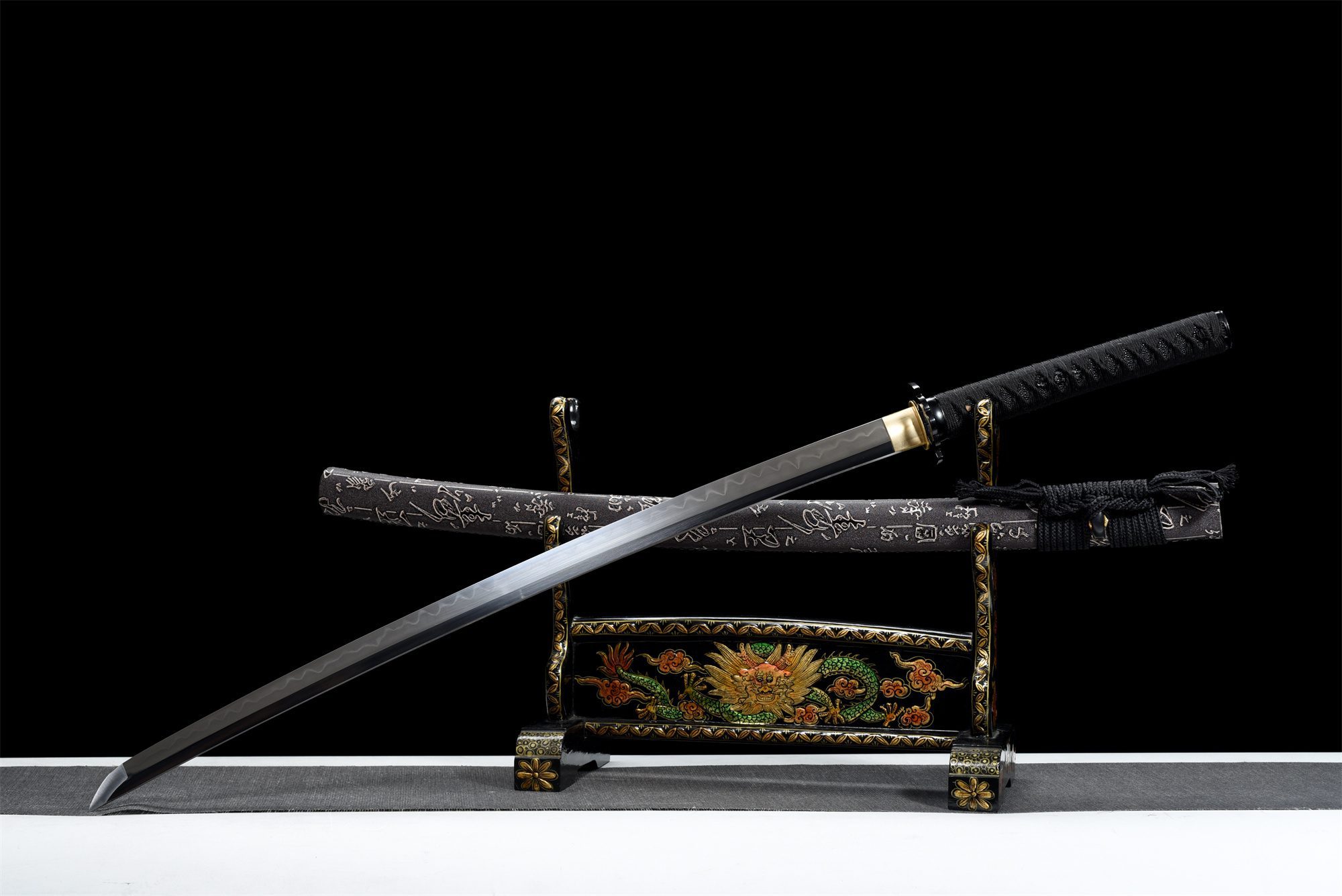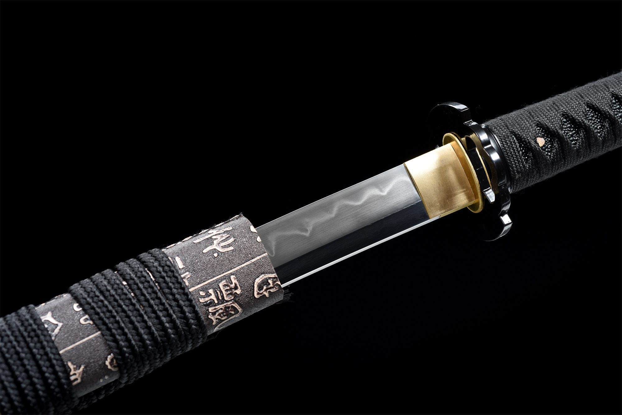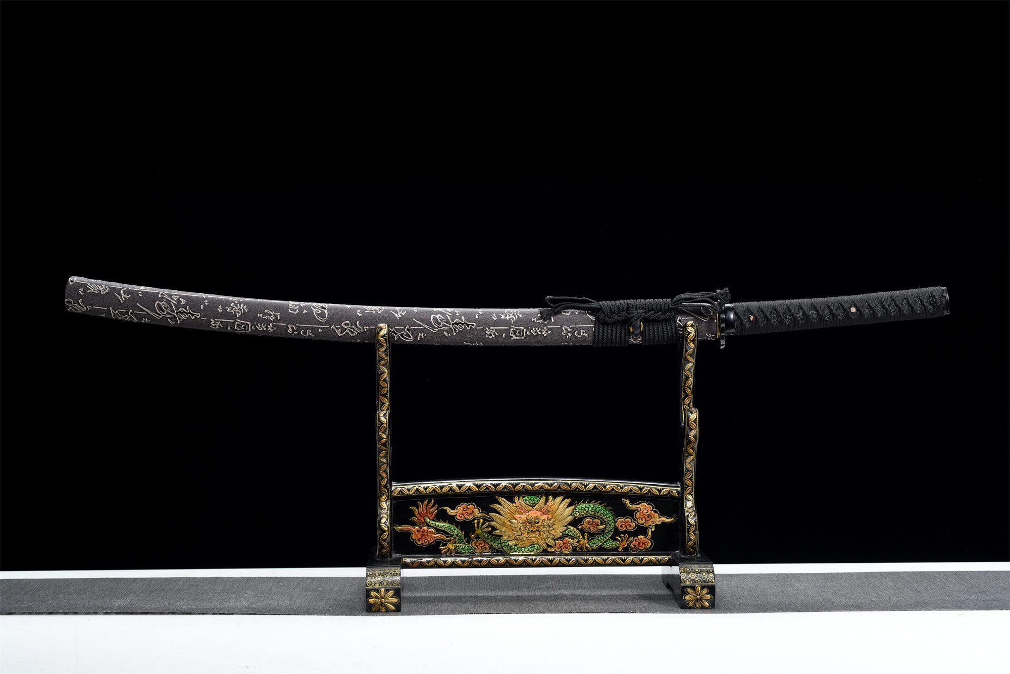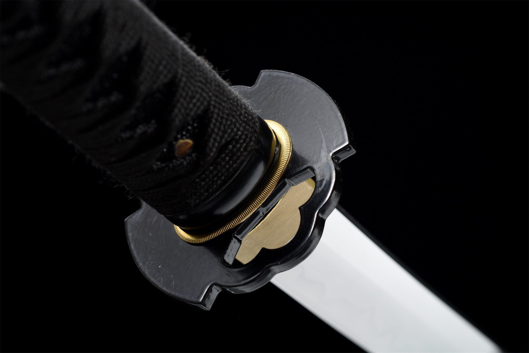 Sen T10-teräksestä valmistetun terän kiillotettu pinta heijastaa valoa luonnollisella eleganssilla, kun taas näkyvä hamon (刃文) todistaa perinteisen differentiaalisen karkaisuprosessin. Pyöristetty musta metalliseos tsuba sopii täydellisesti koko kiinnikkeeseen ja luo halutun visuaalisen jatkuvuuden. Kahva (tsuka) yhdistää massiivipuun lujuuden ja aidon mustan tekorauskuahdan tekstuurin, jota korostaa musta tsuka-ito-punos timanttikuvioisena, joka takaa tukevan ja esteettisen otteen. Mustat lohikäärme-menuki-koristeet lisäävät voimakkaan symbolisen ulottuvuuden, kun taas musta metalliseosfuchi ja kashira täydentävät värimaailman harmonian. Massiivipuusta valmistettu, mustalla nahalla päällystetty tuppi (saya) erottuu herkillä valkoisilla symboleillaan, jotka luovat silmiinpistävän kontrastin mustan sageon kanssa.
