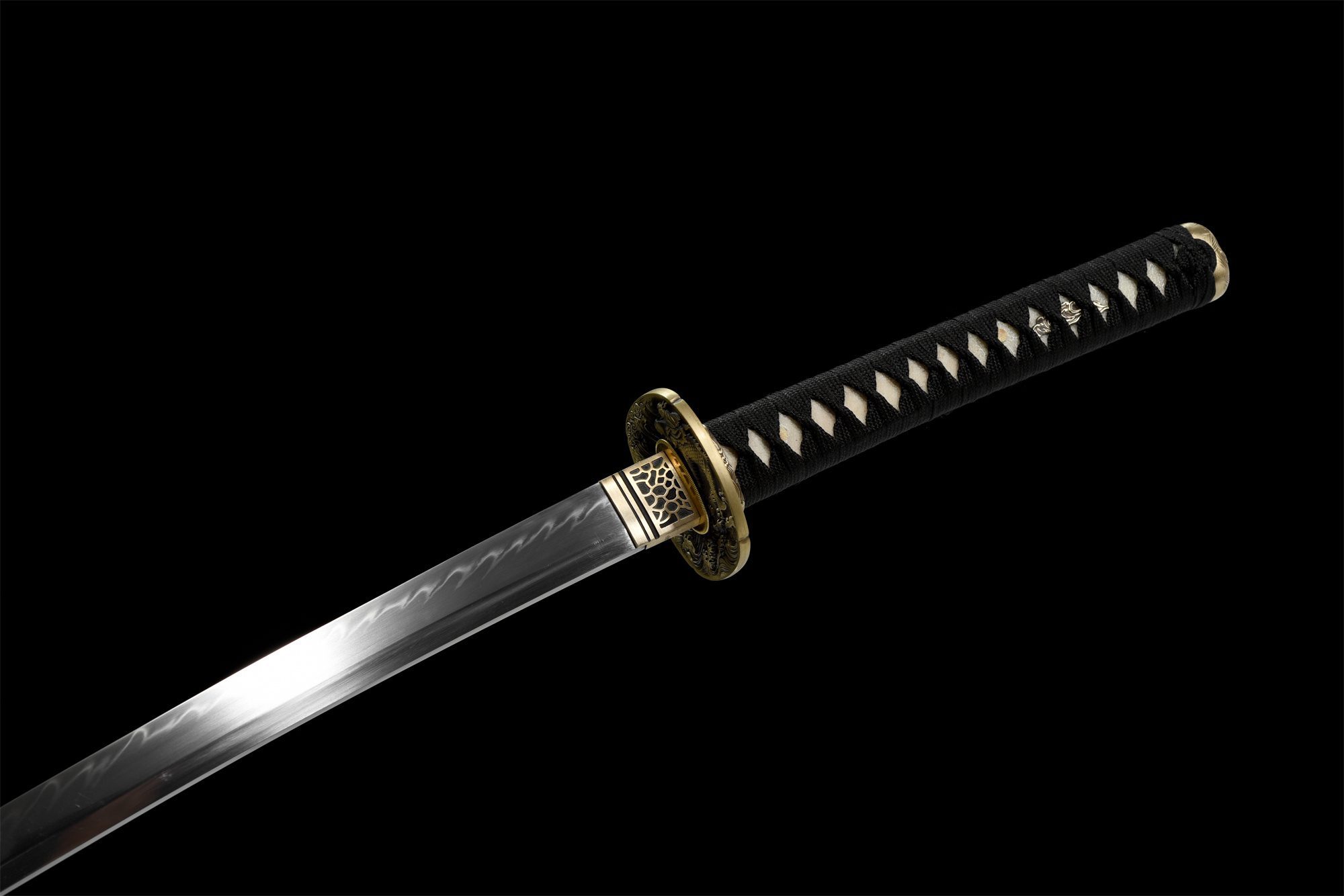 - Tsuka-ITO (柄糸): Musta punottu kahvan yläpuolella timanttikuvioisena.