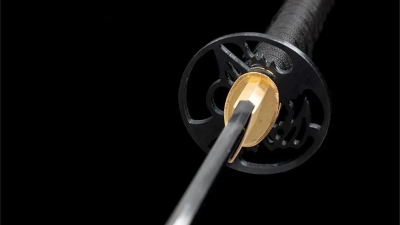 - Tsuba (鍔): harmaa metalliseos, pyöristetty, geometrisin kuvioin kaiverrettu.