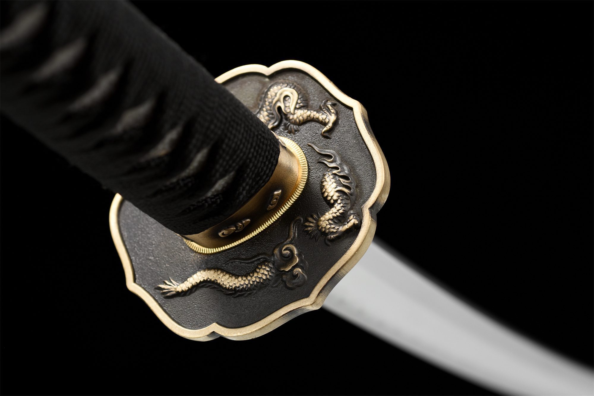 - Suojus (Tsuba 鍔): Kulta- ja mustakupariinen lootuksen muotoinen, koristeltu kaiverretulla vedenalaiseen sukeltavalla lohikäärmellä.