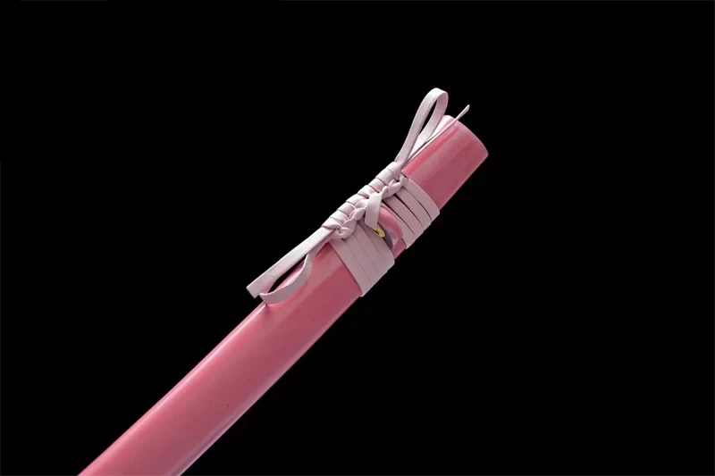Tämä upea vaaleanpunainen katana näyttää upealta vaaleanpunaisella tuppeen, johon on sidottu vaaleanpunainen nahkainen sageo. Leikkisyys ei lopu tähän, sillä Tsuka-ITO on myös vaaleanpunaisesta nahasta, sidottu timanttikuvioin PU-valkoisella samegawalla (rauskun nahkaimitaatio) peitetyn kahvan yläpuolelle. Valkoinen suojus kontrastoi kauniisti muun miekan kanssa, ja siinä on pieniä vaaleanpunaisia kukkia. Lopuksi, suojuksen yläpuolella on messinkinen habaki ja T10-teräs terä, joka voidaan leikata haluttuun terään. Tämä vaaleanpunainen katana on tarkoitettu sekä koristeeksi että leikkaamiseen.