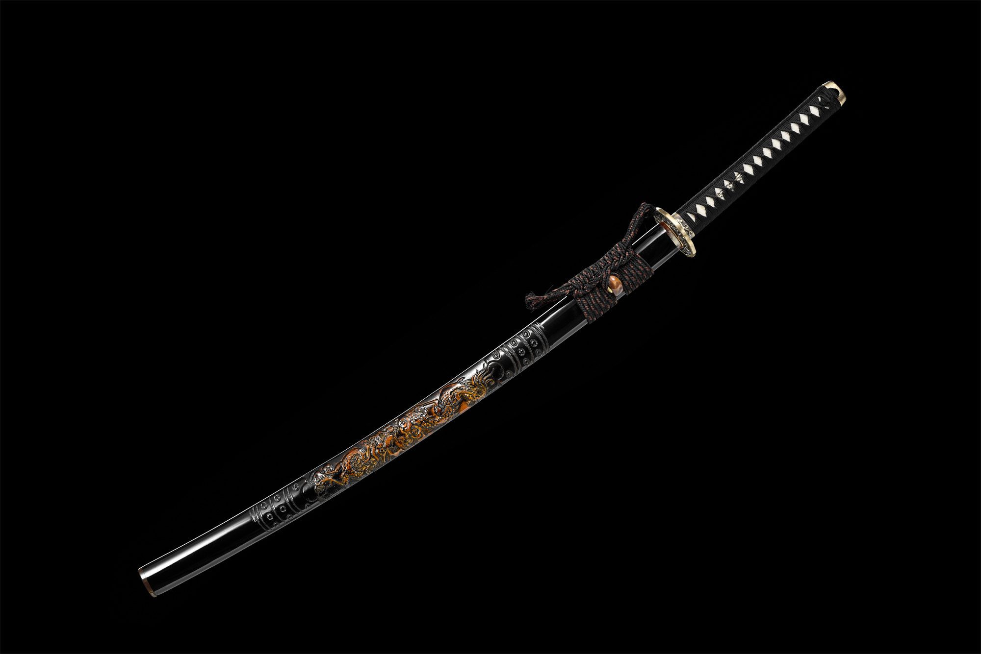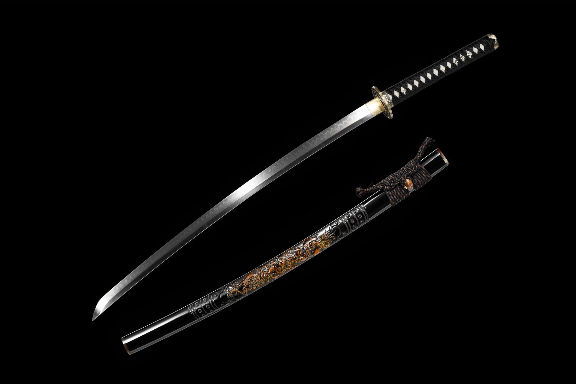 Savi-karkaistu T10-teräksinen terä paljastaa upean choji hamonin (刃文), joka kiemurtelee kuin lohikäärmeen hengitys terän reunaa pitkin. Tämä differentiaalinen karkaisu luo teräkseen hienovaraisia vivahteita, kun taas pyöreä kullattu kuparinen tsuba on koristeltu erittäin herkillä avoimilla kukkakuvioilla, joita täydentää perinteinen hitsu-ana. Kahva paljastaa hienostuneen rakenteen, jossa on aito samegawa, joka on peitetty mustalla timanttimuotoisella punoksella, jota korostavat hienovaraisesti kimaltelevat hopeiset menuki. Vasaroidut kullatut kuparielementit (fuchi, kashira ja habaki) tarjoavat silmiinpistävän esteettisen yhtenäisyyden. Musta lakattu tuppi on koristeltu reliefiin veistetyllä lohikäärmellä, kun taas aidot sarvielementit (koiguchi ja kojiri) ovat osoitus poikkeuksellisesta käsityötaidosta.