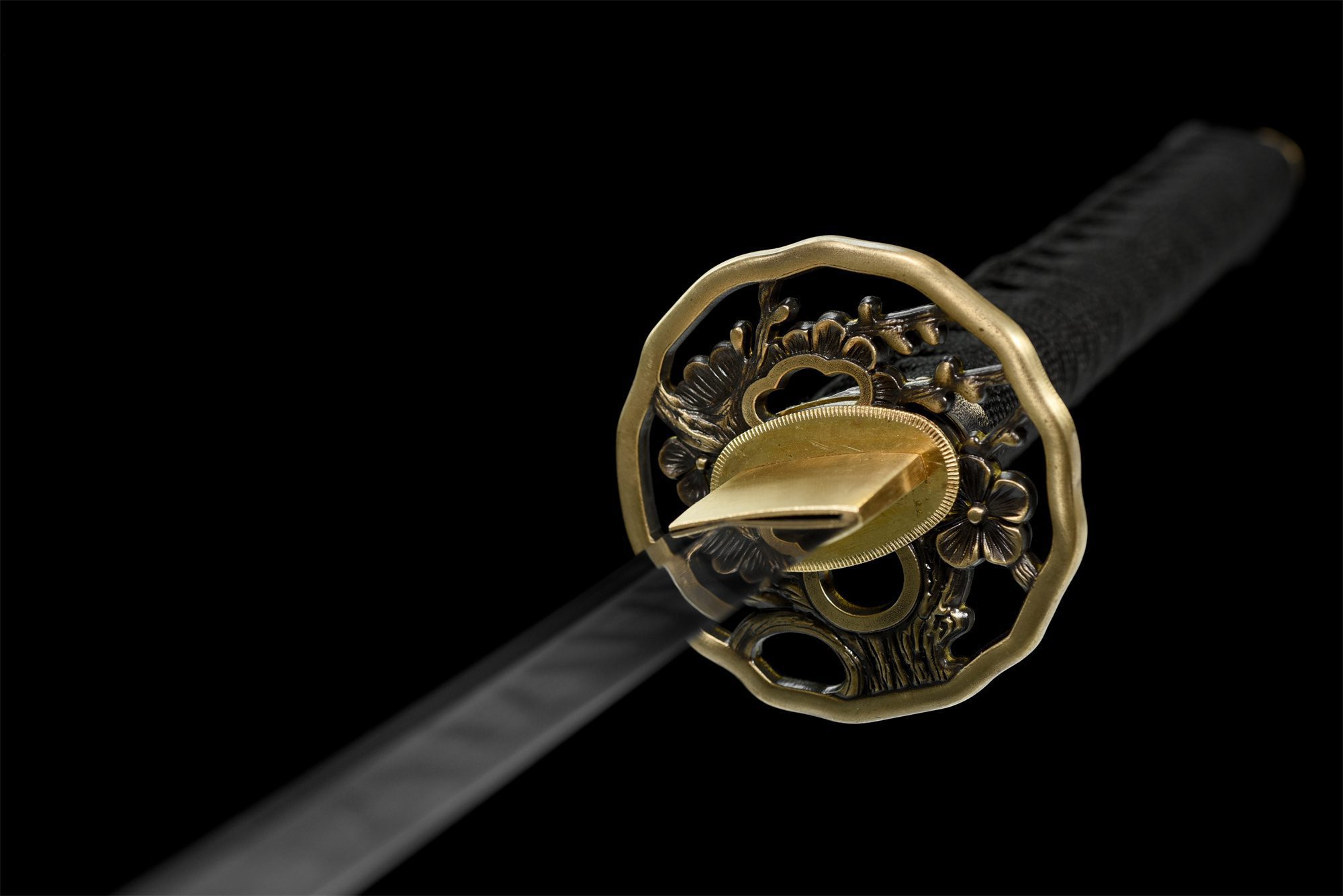 - Suojus (Tsuba 鍔): Kullattu kuparinen pyöreä tsuba, veistetty ja koristeltu kukka-aiheisilla kuvioilla, hitsu-ana kogatana- ja kōgai-terille.