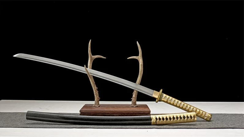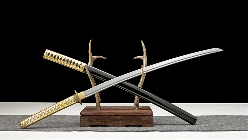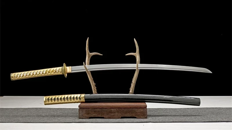 Yūga (優雅) katana-miekka mustana ja kultaisena on erittäin elegantti. Sen T10-teräksinen terä, teroitettu tai teroittamaton, on poikkeuksellisen kestävä. Sen valkoisen rauskujen nahkaa jäljittelevä kahva on kääritty kultaisella synteettisellä silkkisellä Tsuka-ITO:lla, joka tarjoaa mukavan ja ylellisen otteen. Pyöristetty, ontto, kullattu metalliseoskaulus ja tuppi, joka on valmistettu mustaksi lakatusta kovapuusta ja jonka yläosa on koristeltu timanttimuotoisella punotulla kullatulla itolla, tarjoavat tyylikkään viimeistelyn. Kultaiset lohikäärmeen muotoiset menuki-koristeet ja messinkiset habaki-koristeet viimeistelevät ulkonäön.