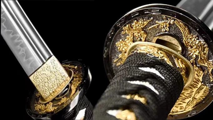 - Tsuba (鍔): musta reunus, pyöreä kahva, keskellä kullatut kukkakuvioiset kaiverrukset.