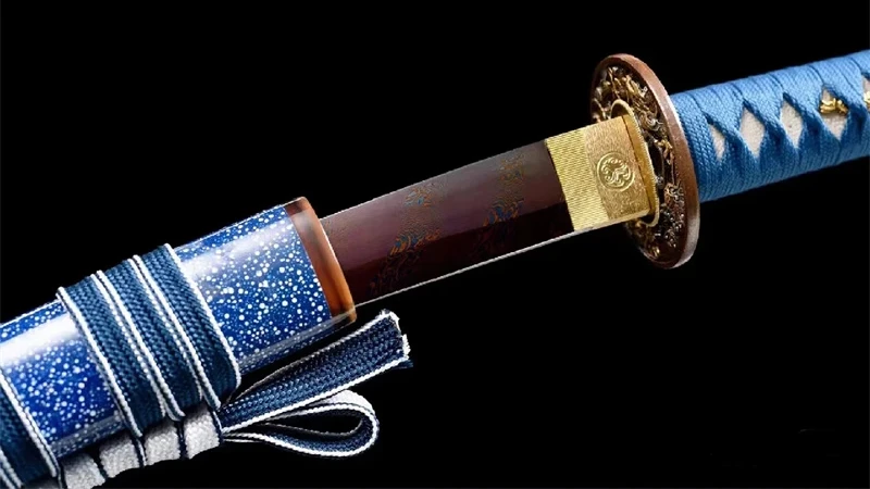 - Tsuka-ITO (柄糸): taivaansininen punos kahvan yläpuolella, perinteisillä tsukamaki-kuvioilla.