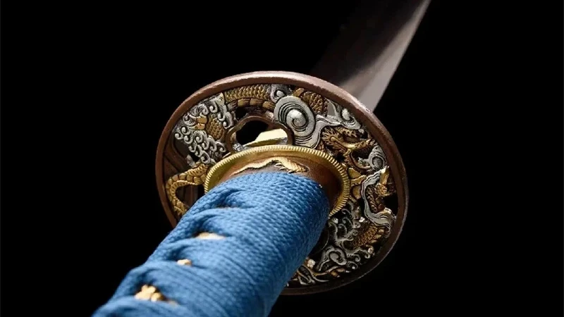 - Menuki (目貫): kultainen lohikäärme integroitu Tsuka-punoksen alle.