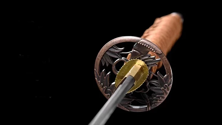 - Tsuba (鍔): sinkki-kupariseos, pyöristetty ja kasvien muotoon kaiverrettu.