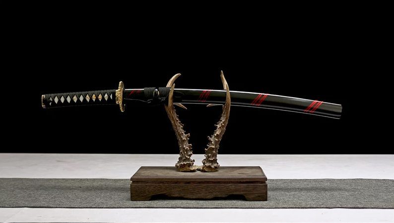 Tämä musta wakizashi, joka on käsin taottu ammattitaitoisten miekka-aseiden valmistajiemme toimesta, on varustettu 1045-teräksellä valmistetulla terällä, jossa on aaltomainen hamon(刃文). Terän teroitus on valinnainen. Mustaksi lakattu puinen tuppi on koristeltu käsin maalatuilla punaisilla viivoilla, jotka muodostavat kauniin väriyhdistelmän.