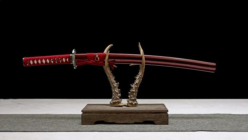 Tämän punaisen wakizashin terä on 52 cm pitkä ja valmistettu 1045-teräksestä, ja siinä on aaltomainen hamon (刃文). Rautinen suojus on pyöreä, ja siinä on neljä pientä lovetta sekä veistetty lohikäärme, joka kiertää terää. Tsuka eli kahva on valmistettu kovapuusta ja valkoisesta PU-samegawasta.