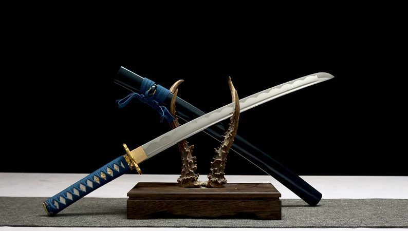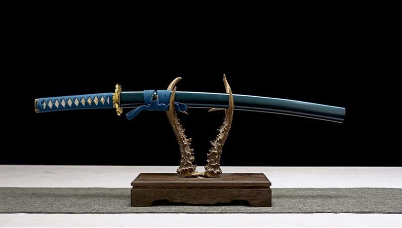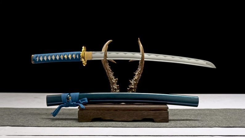 Tämä sininen wakizashi, jonka 1045-teräksinen terä paljastaa aaltomaisen hamon(刃文), on saatavana teroituksella. Puinen saya on lakattu siniseksi turkoosilla kiillolla, kun taas sageo on vaaleamman sininen, mikä korostaa tuppea.